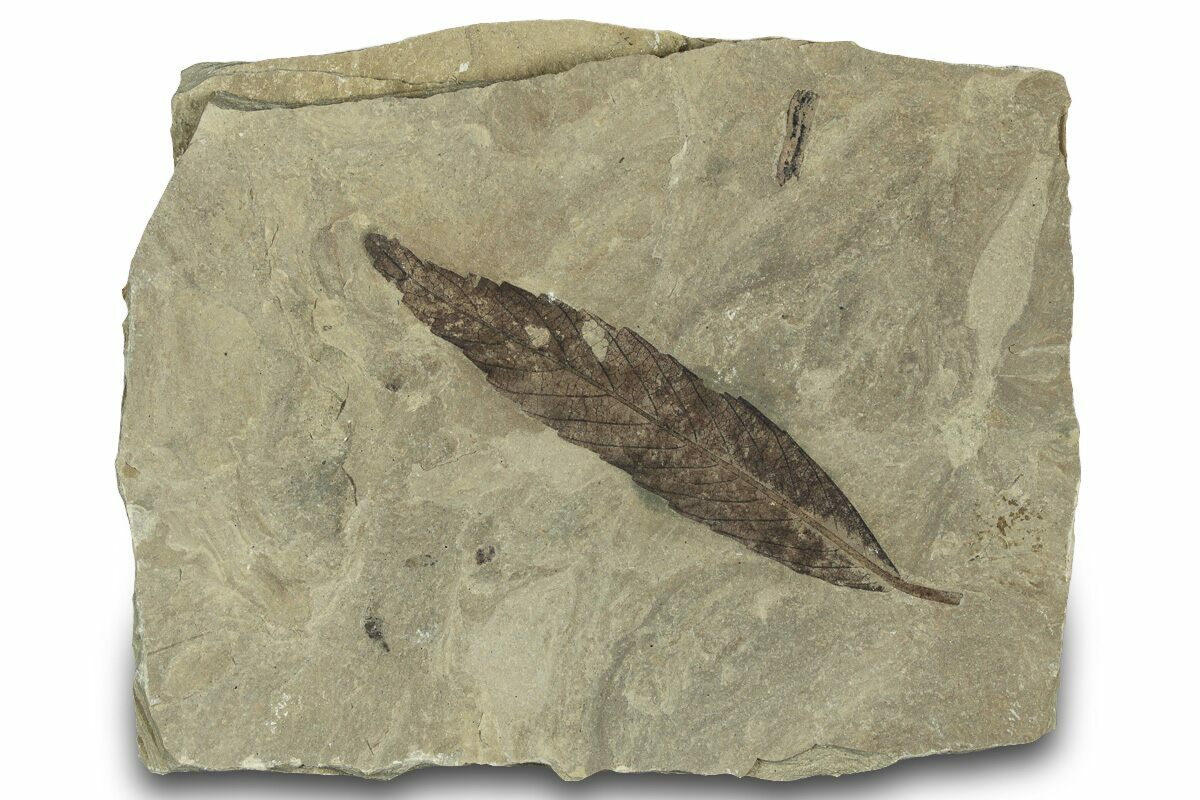 This is an Eocene aged fossil leaf of Cedrelospermum nervosum, an extinct species of plant classified within the Ulmaceae family, which includes modern trees like elm and hackberry. The leaf is 2.35" long and on a piece of shale. It is nicely preserved with crisp edges and brown coloration.