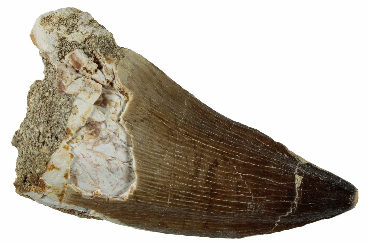 This is a 2.35" fossil mosasaur (Prognathodon sp.) tooth from the Upper Cretaceous phosphate deposits in the Oulad Abdoun Basin of Morocco.