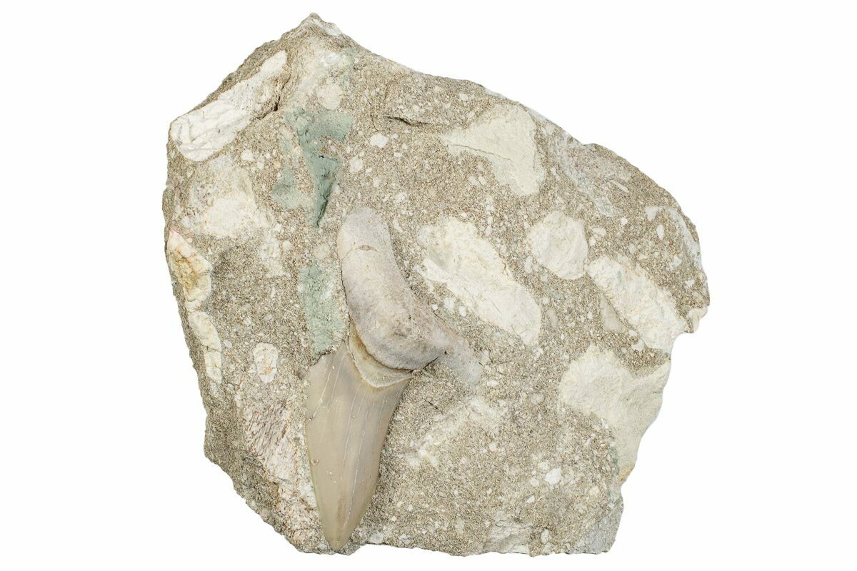 This is a 2.35" fossil tooth of the extinct giant mackerel shark, Otodus obliquus, from the phosphate deposits in the Oulad Abdoun Basin of Morocco. It is Eocene in age, or approximately 54 million years old. The tooth is only partially exposed from the rock in which it was found.