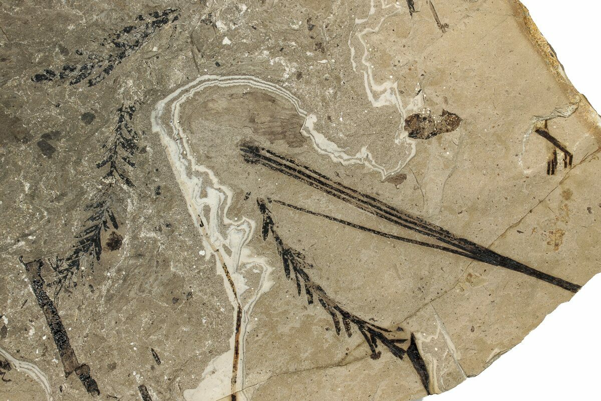 This is a plate chock-full of conifer fossils from the McAbee fossil beds of British Columbia, Canada. It contains a needle bunch of the genus Picea (3.4"), as well as several branchlets of either Metasequoia or Sequoia needles. Many other small needle and twig fragments are scattered throughout the plate. Another prominent Picea needle bunch can be found on the other side of the plate.