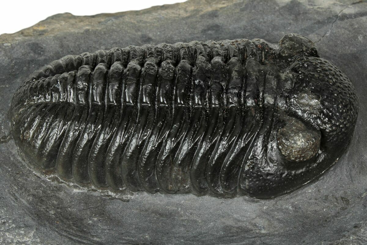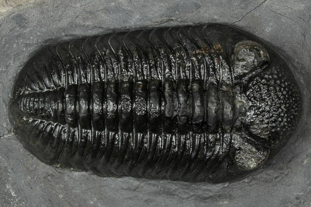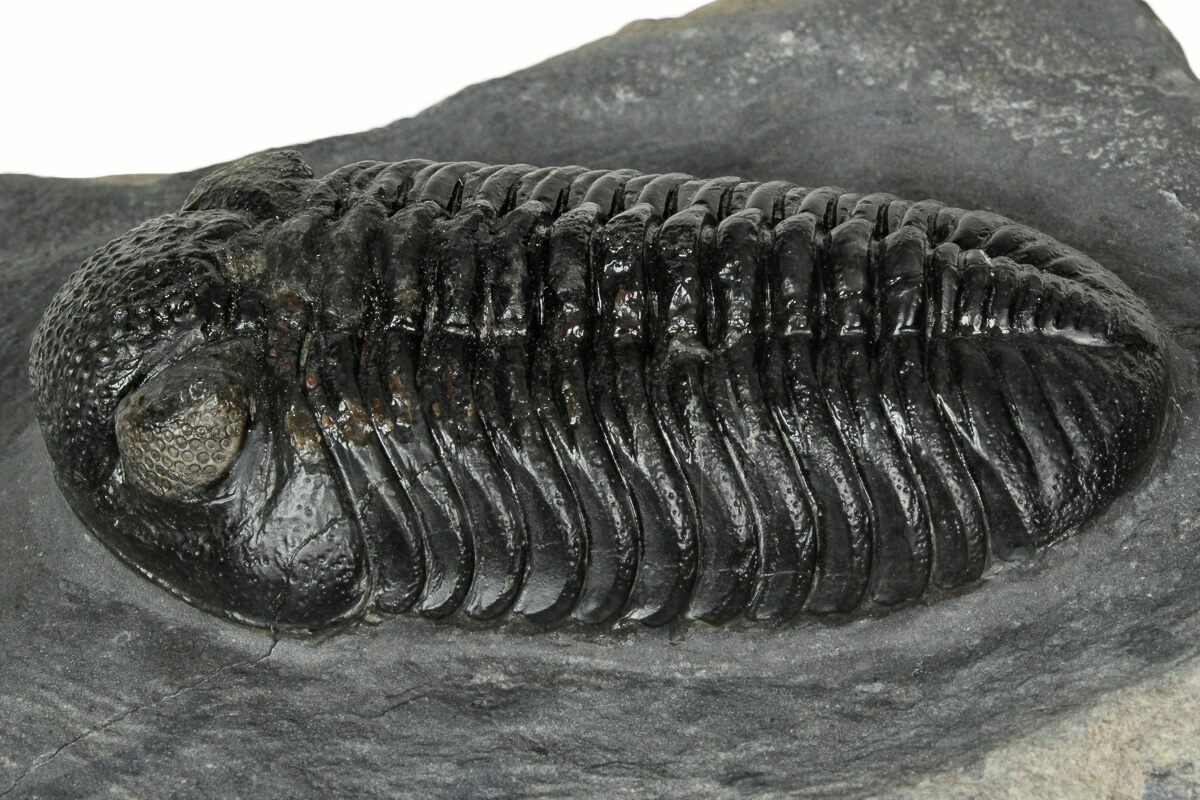This is a prone 2.35" long prone phacopid (Pedinopariops vagabundus) trilobite from Mrakib, Morocco. It has excellent eye facet detail in both eyes. It has about 2% shell restoration in total.