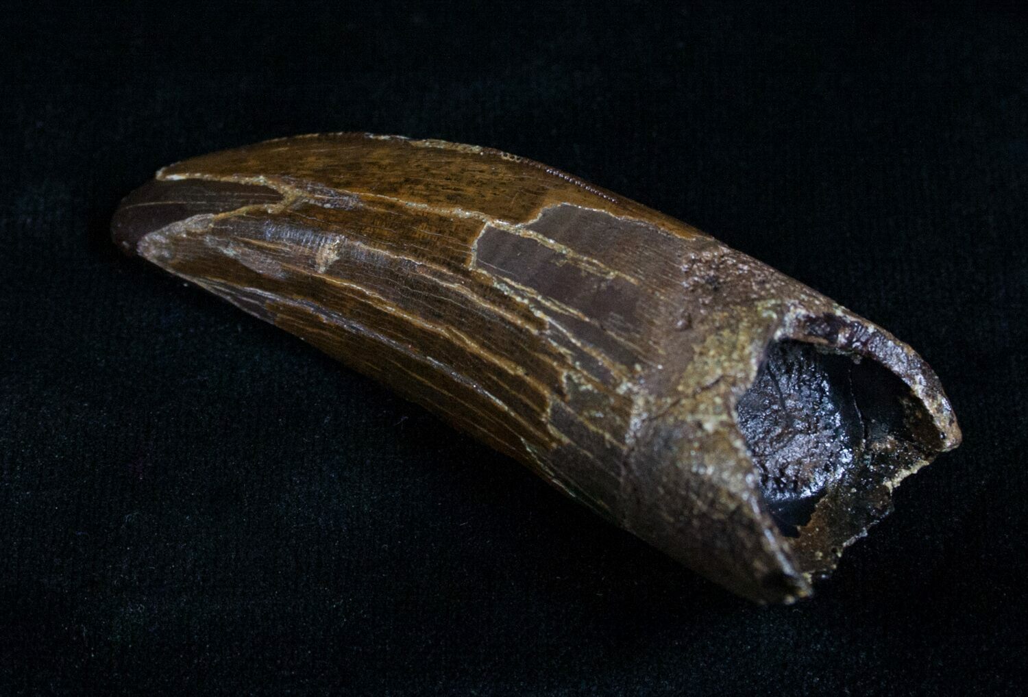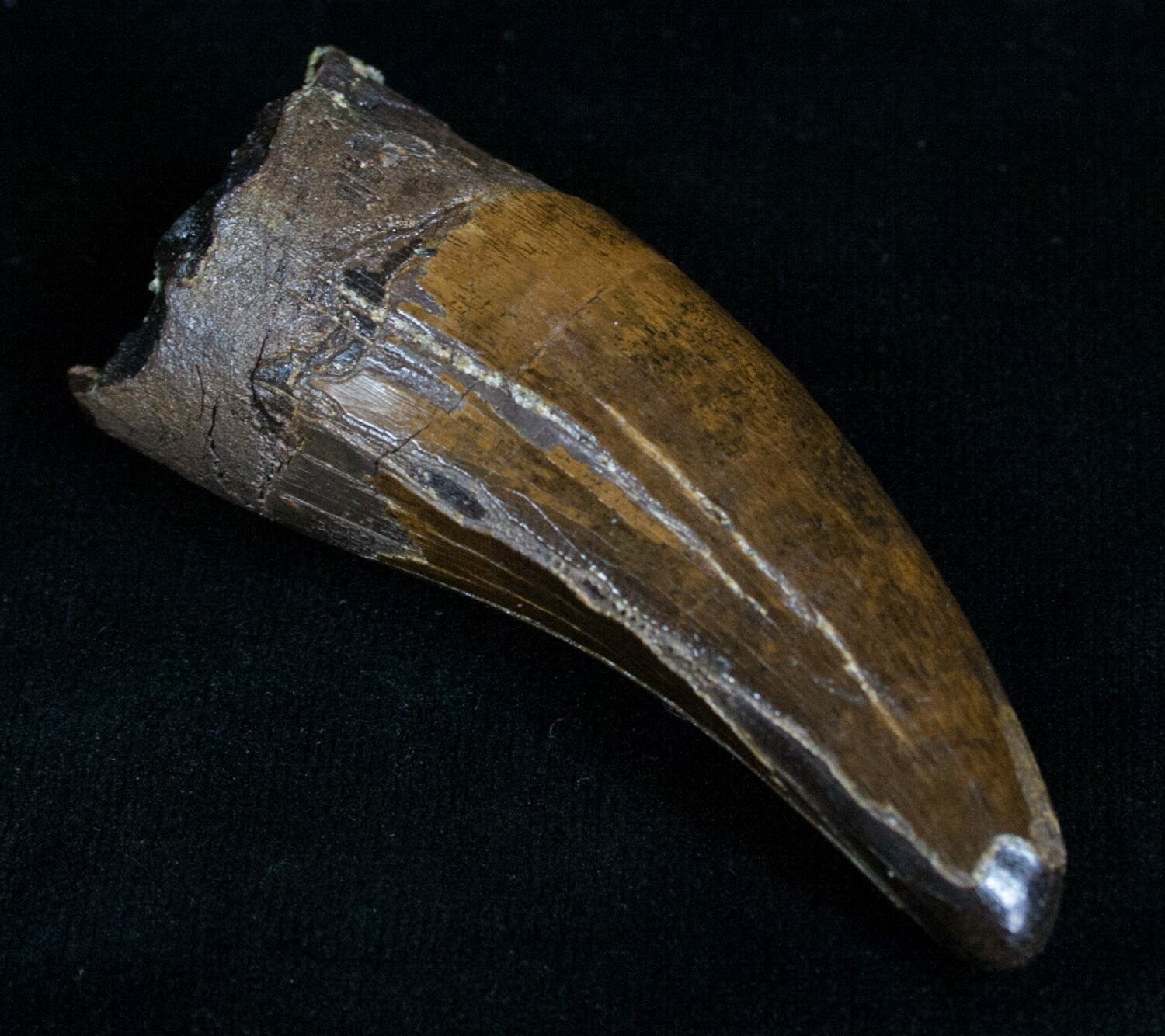 High quality Tyrannosaurus rex teeth are not only hard to find but are probably the most collectable type of fossil there and tend to get snapped up as soon as they hit the market. This one is in excellent shape with beautiful enamel preservation and is 2.36" long (straightline). There is some natural feeding wear to the tip and about 2/3 of the serrations are visible. There is a single repair to the base of the tooth but no restoration. Not only is this a rare, hard to acquire tooth but it is in great shape overall.