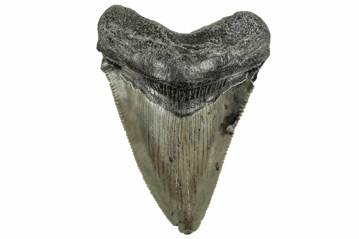 This is a beautiful serrated, 2.37" long fossil Carcharocles chubutensis? shark tooth. It has nice serrations and nice enamel preservation. There appears to be a cusp, however both are incomplete, so it is difficult to tell the species.