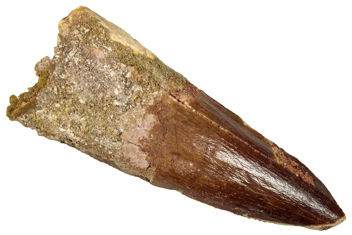 Spinosaurus teeth are relatively common fossils, but large (3+ inches), well-preserved examples are rare. These large Spinosaurus teeth will often be heavily doctored. We’ve seen many examples where multiple partial teeth can been glued to together to create a larger fake tooth, or where enamel has been painted on. One giveaway to look for is a ring of sand around the middle of the tooth, usually glued on to hide a break. Sometimes this is a sign that multiple partial teeth have been composited, but other times it is used to disguise a badly done repair job.