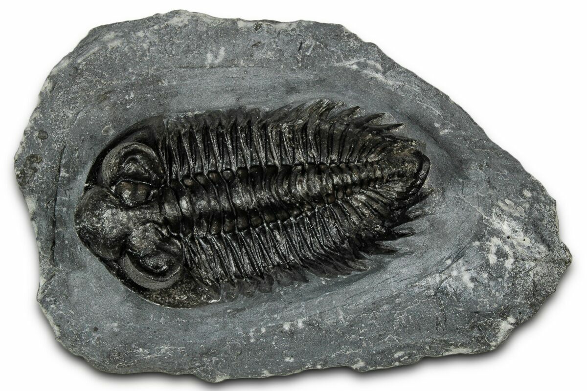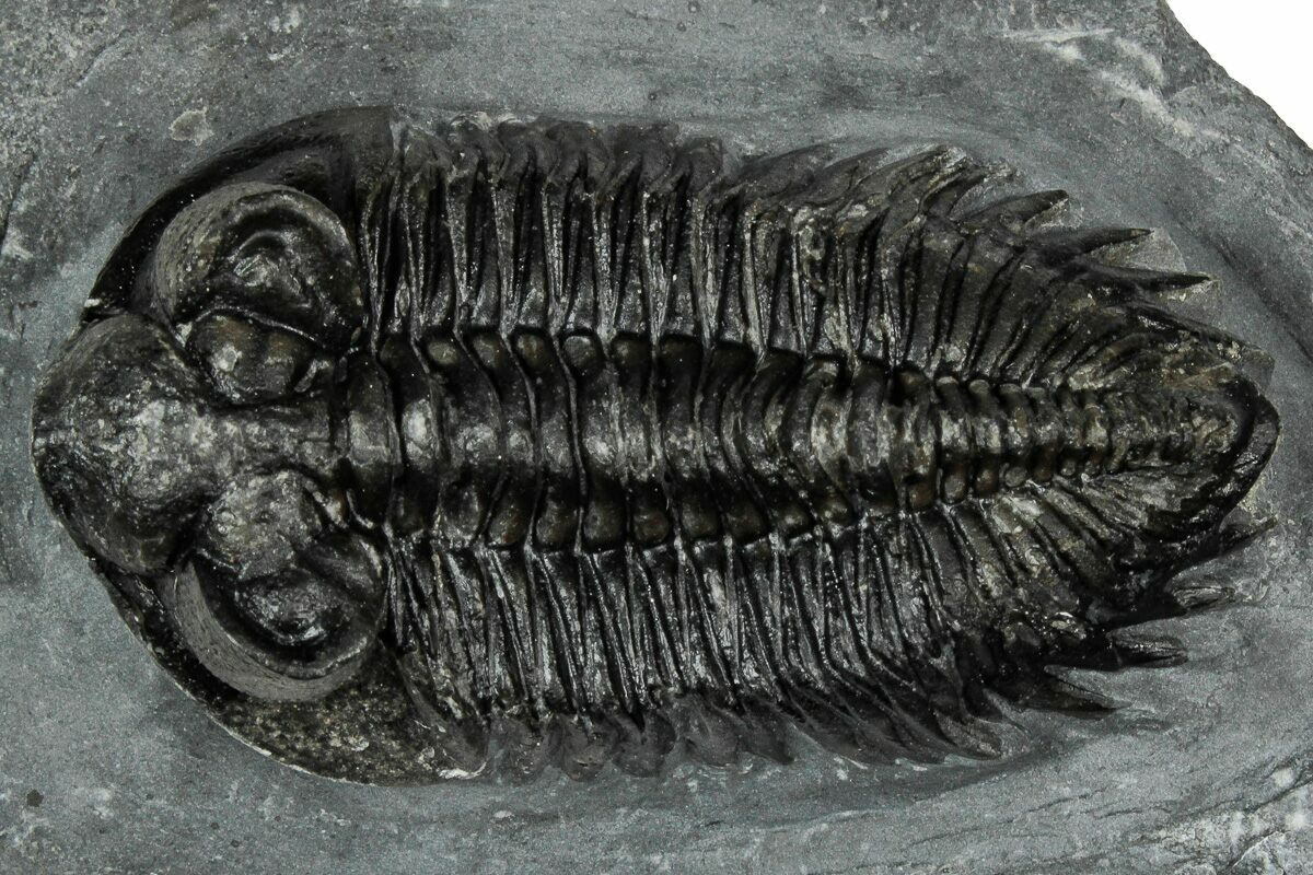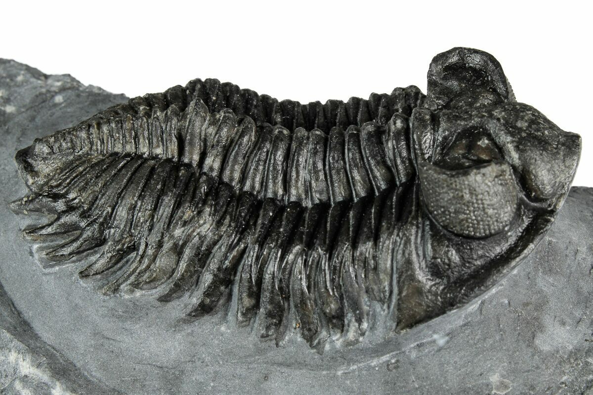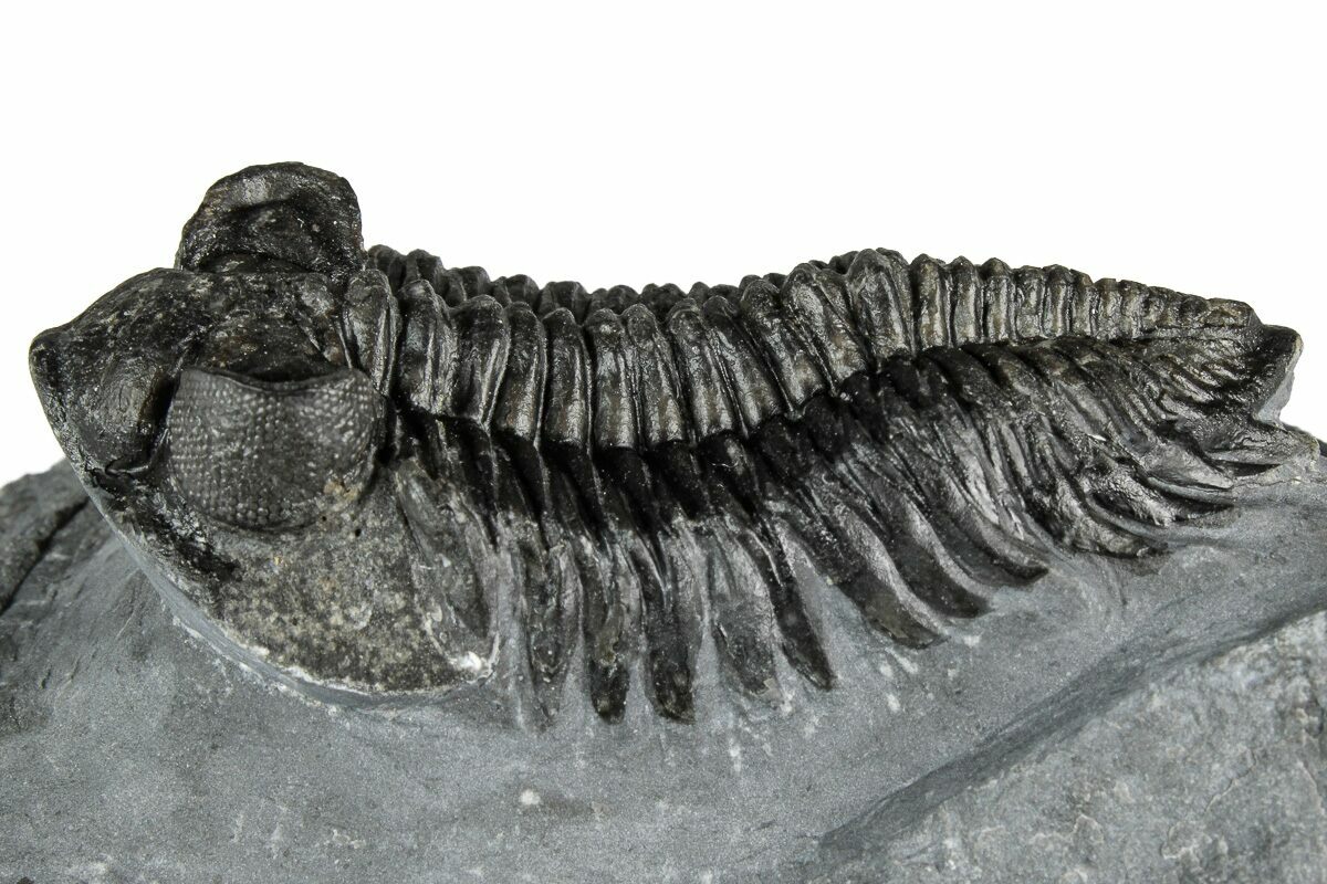 This is a prone, 2.4" long, prone Coltraneia trilobite with amazing "tower eyes" full of hundreds of eye facets. The genus has often been referred to as Treveropyge in the past. It was quarried at Ofaten Mountain, Morocco.