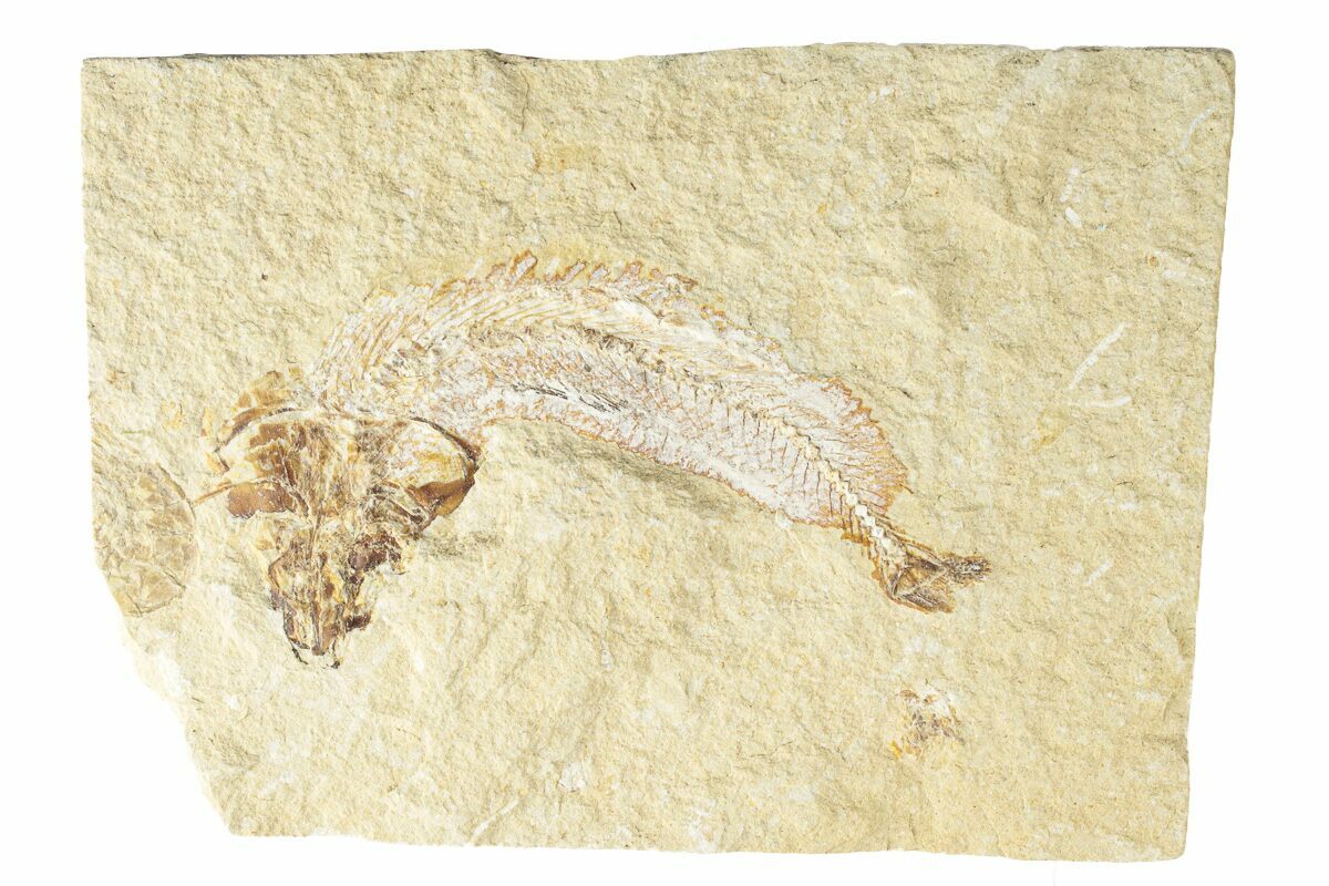 This is a fossil fish from the Upper Cretaceous marine deposits near Hakel, Lebanon. Dozens of species of fish have been described from these deposits, making identification difficult. Given that this fossil has been preserved in a top-down view, identification is even more difficult.