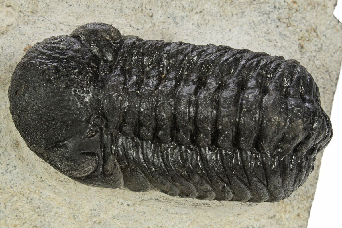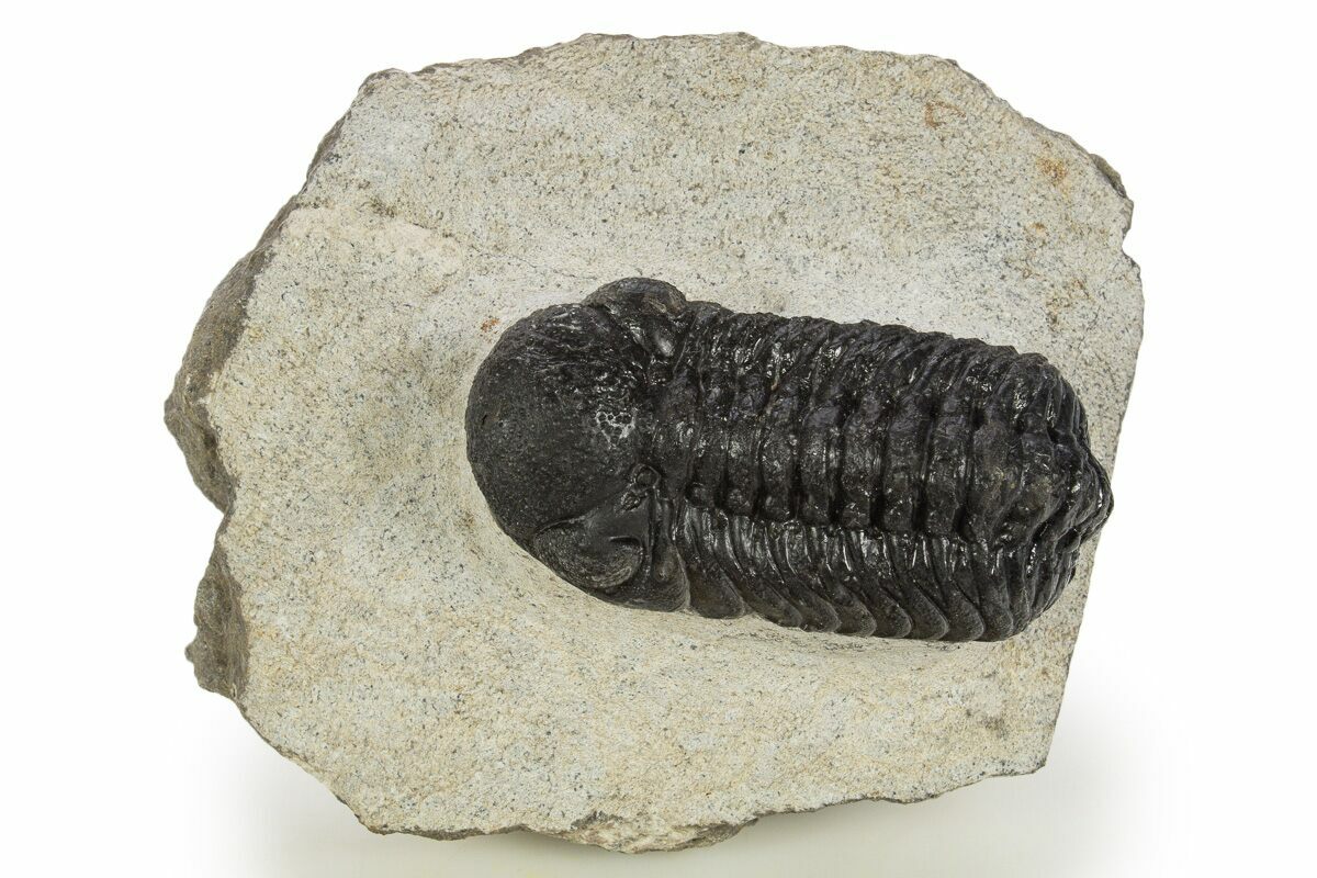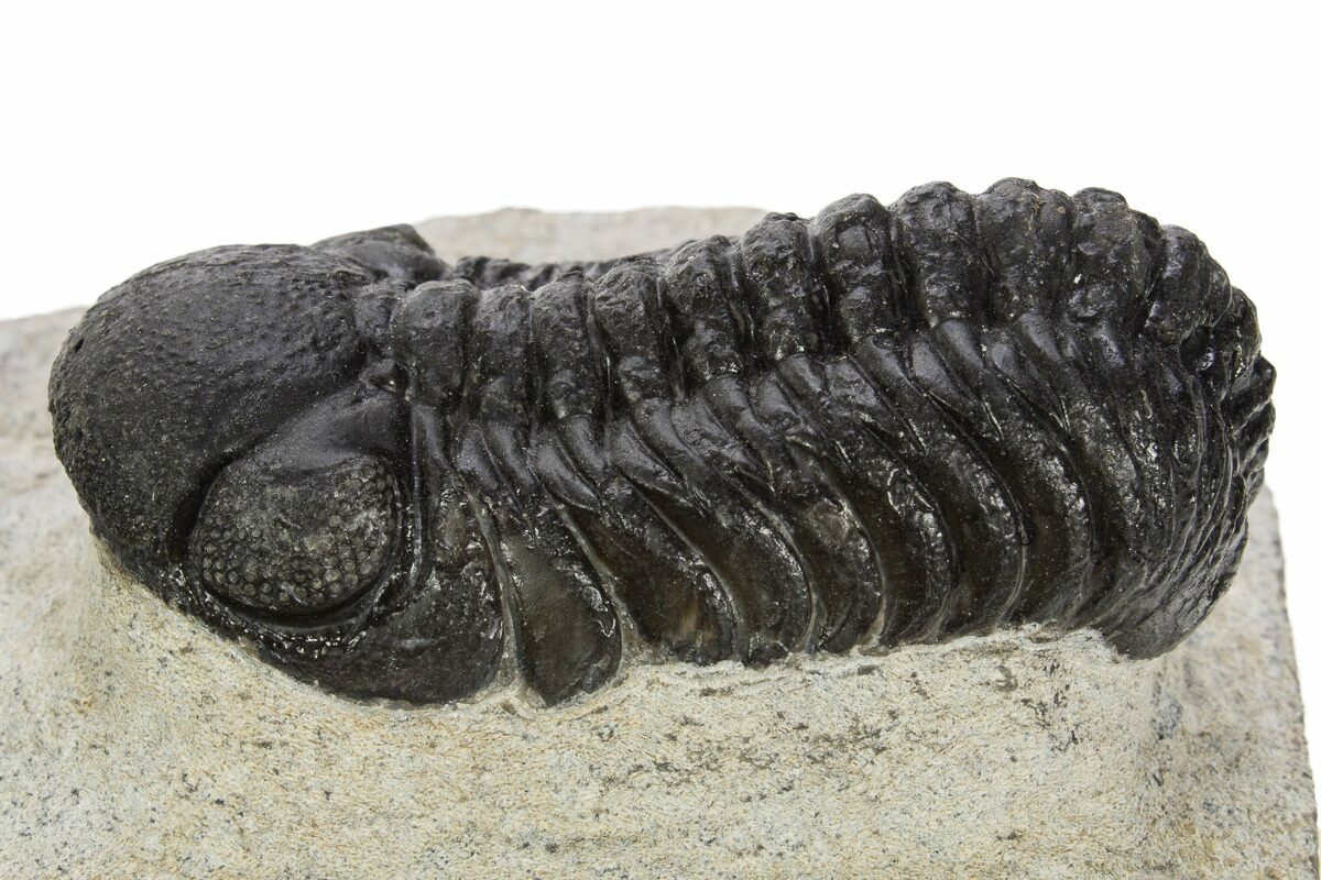 This is a detailed, 2.4" (if outstretched) long Austerops trilobite from Morocco. There is good eye facet preservation in both eyes. It has about 5% shell restoration in total.