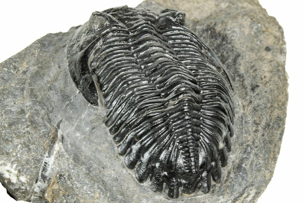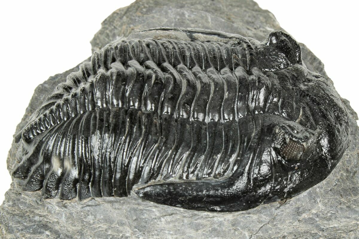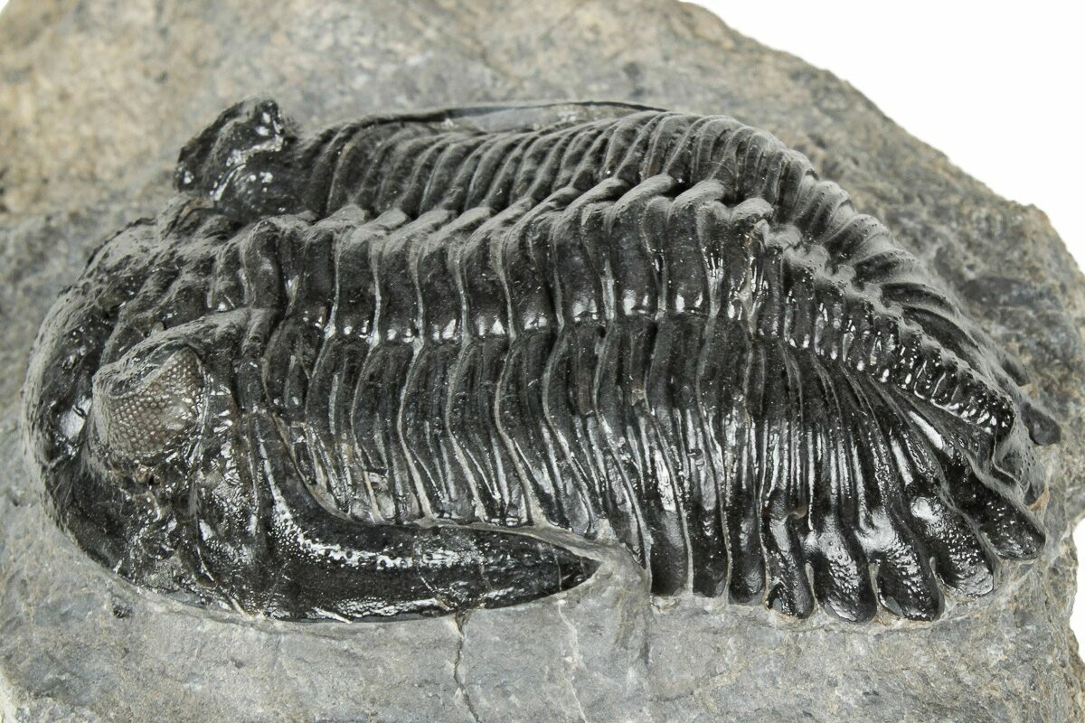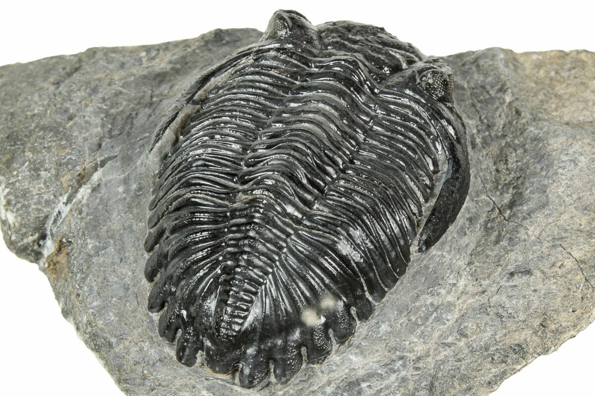This is a detailed, 2.4" long Hollardops trilobite fossil quarried near Ofaten, Morocco. It has visible eye facet preservation in both eyes. There is about 2-3% shell restoration along repaired cracks.