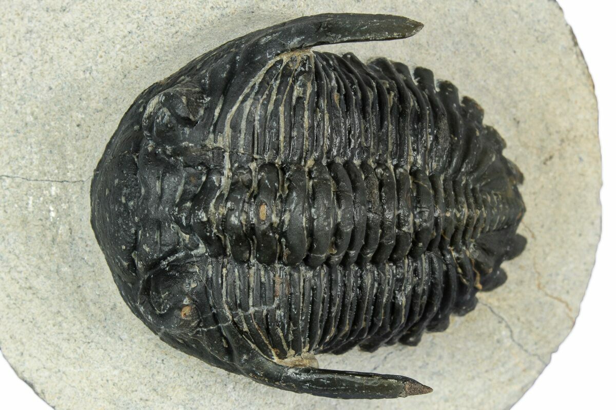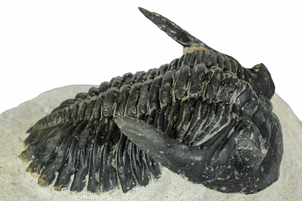 This is a detailed, 2.4" long Hollardops trilobite fossil from Ofaten, Morocco. It has preserved eye facets in both eyes and the genal spines have been prepared free-standing. It has about 2-3% shell restoration in total.