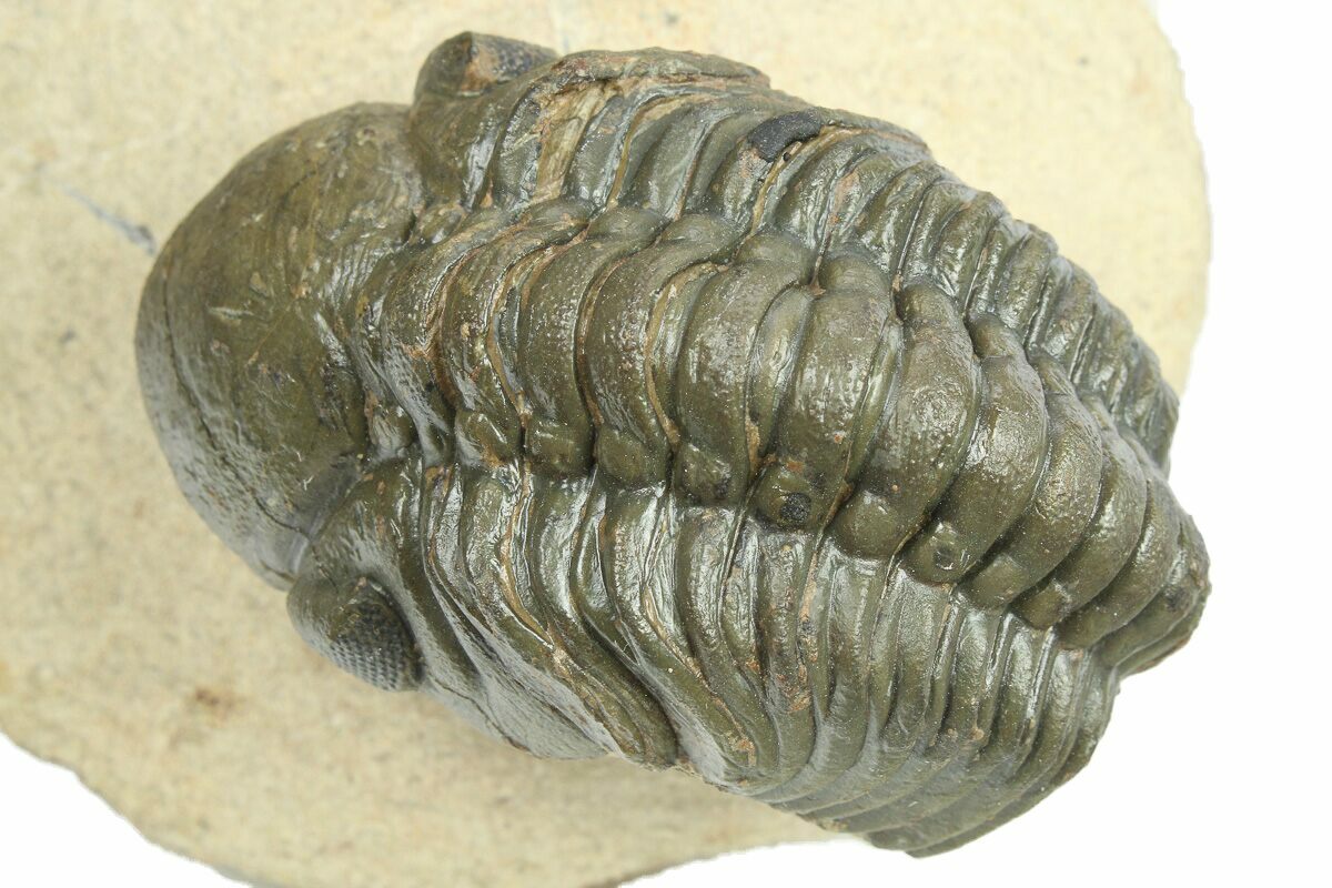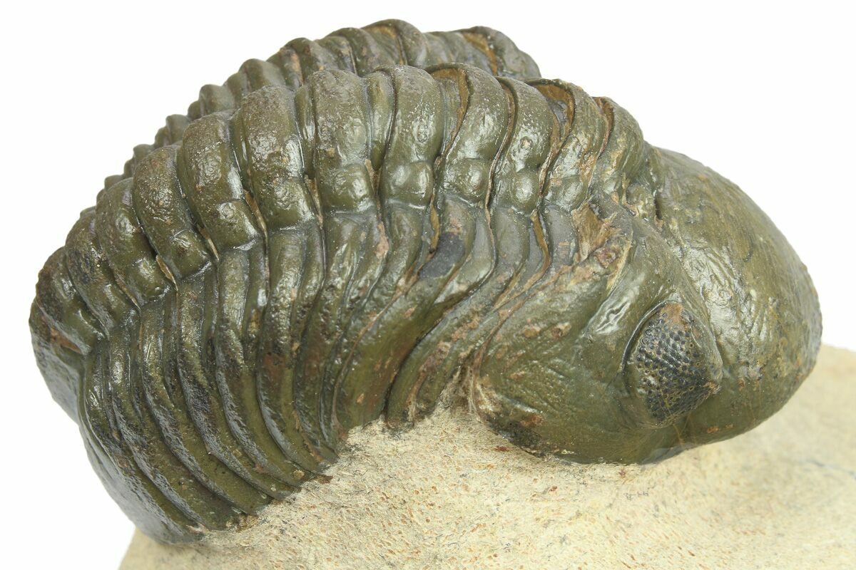 This is a 2.4" long, dark chocolate brown Reedops trilobite collected near Atchana, Morocco. It has a lot of surface detail including visible preserved eye facets in its eyes. It has been prepared to remove the surrounding limestone so that it looks like it's ready to crawl off the rock. It has has less than 1% restoration.