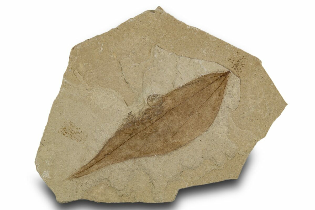 This is an Eocene aged fossil leaf of Menispermites limacioides, an extinct species of plant from the Menispermaceae family. The leaf is 2.4" long and on a piece of shale. It is nicely preserved with crisp edges and brown coloration.