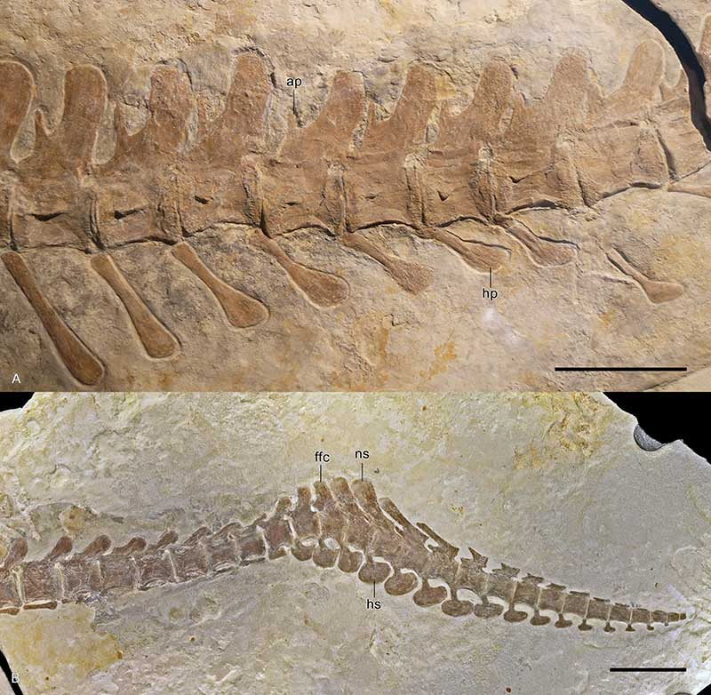 This is a nicely preserved, 2.4" long fossil crocodilian inferior vertebral process (hemapophysis bone) from the Late Jurassic Solnhofen Formation in Germany. It is preserved in the soft stone it was fossilized in, partially exhumed. It belonged to the metriorhynchid marine crocodyliform genus Cricosaurus, however since multiple Cricosaurus species inhabited the Solnhofen habitat, it is difficult to distinguish from this single bone which of those species it belonged to.