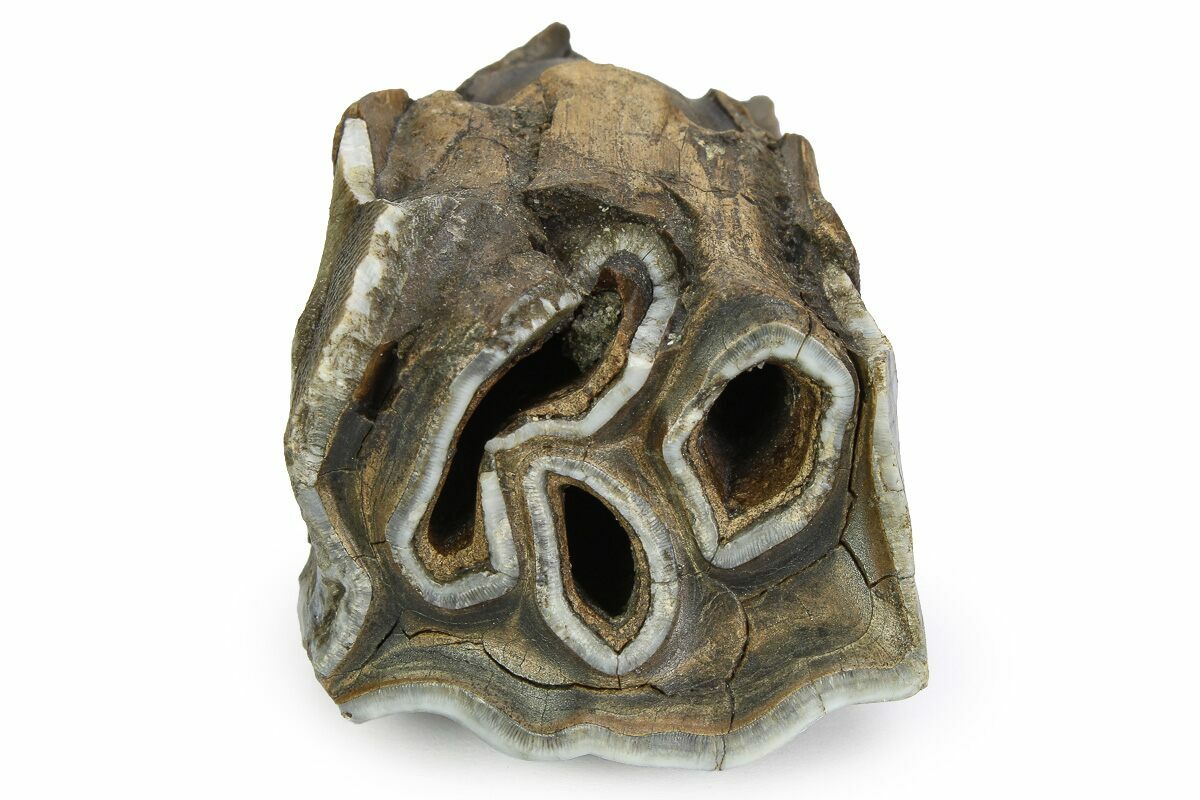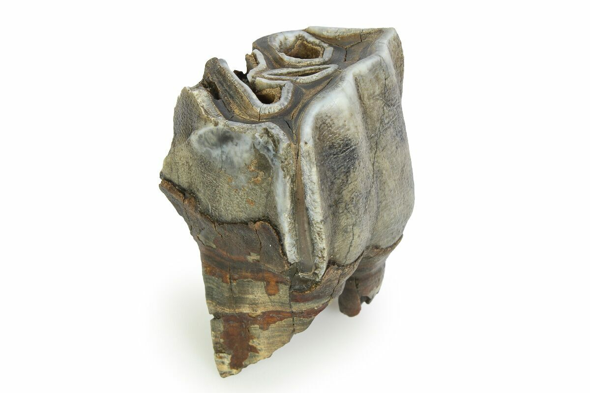 This is a fossil tooth from a woolly rhinoceros (Coelodonta antiquitatis). The fossil comes from Siberia, Russia, where many woolly mammoth and woolly rhino fossils are unearthed. Including the partial root, the tooth measures 2.4" tall.