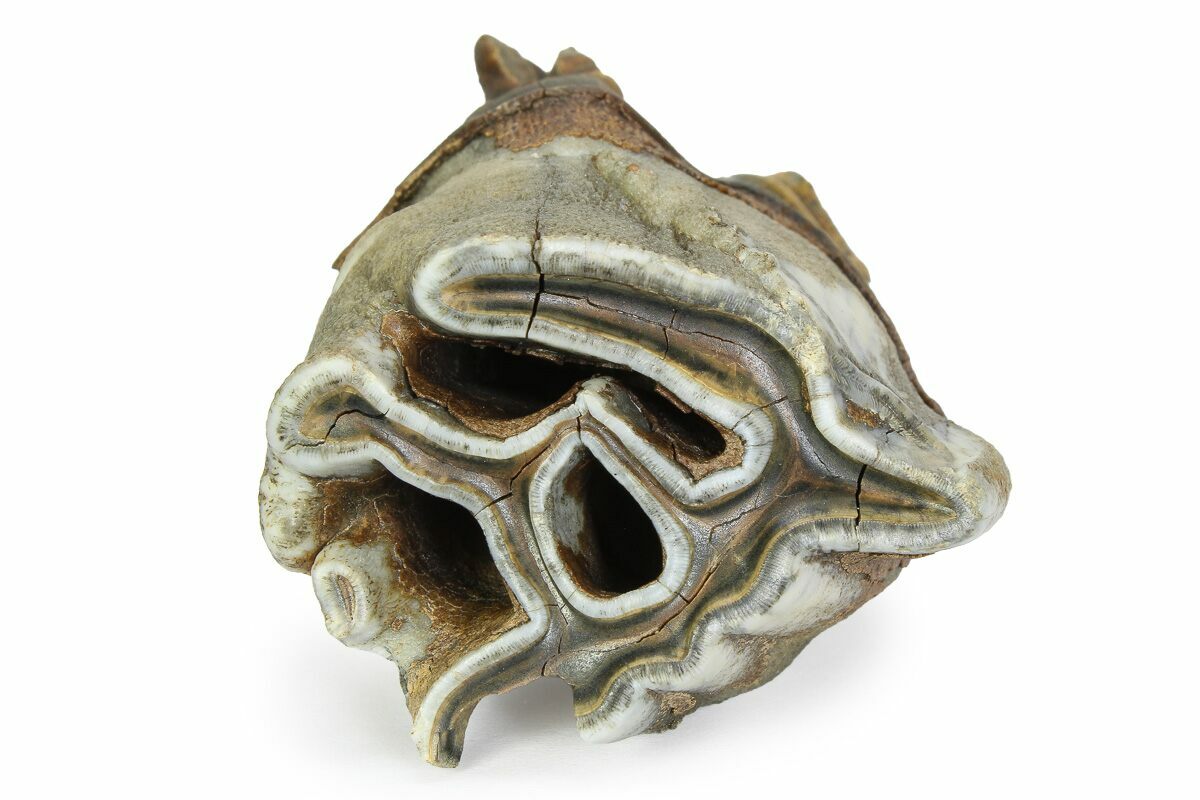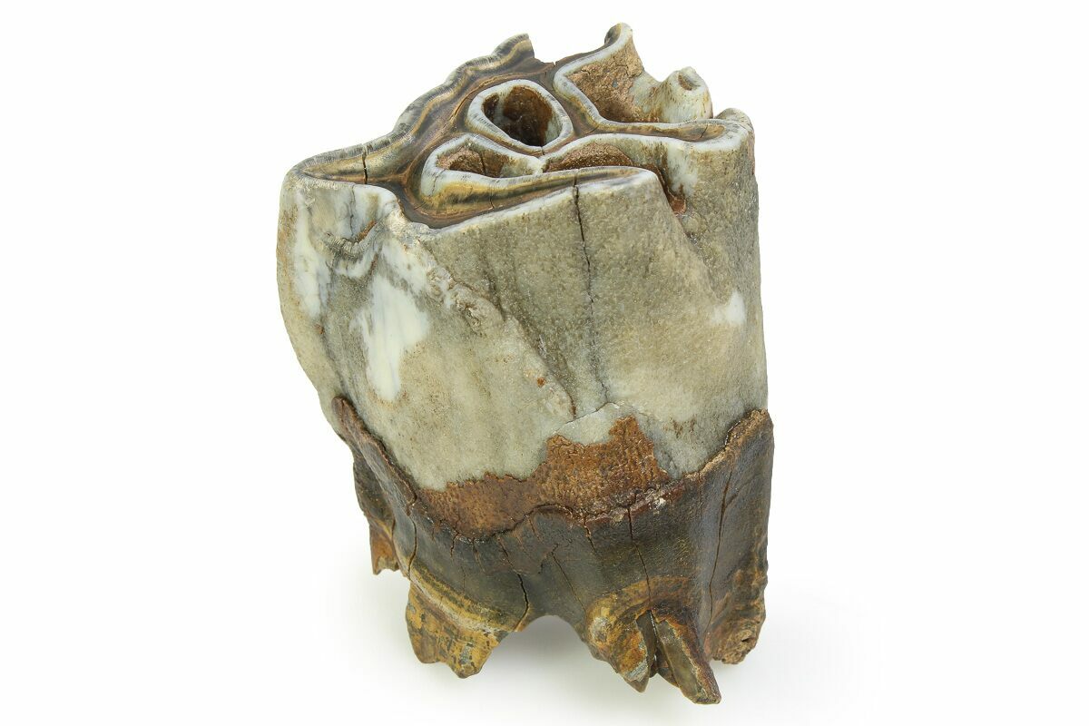 This is a fossil tooth from a woolly rhinoceros (Coelodonta antiquitatis). The fossil comes from Siberia, Russia, where many woolly mammoth and woolly rhino fossils are unearthed. Including the partial root, the tooth measures 2.4" tall.