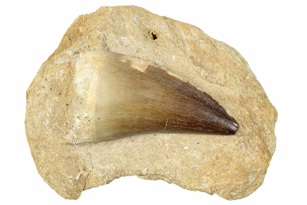 This is a very large and well preserved, 2.4" fossil mosasaur (Prognathodon) tooth from the Upper Cretaceous phosphate deposits in the Oulad Abdoun Basin of Morocco. It has excellent enamel and is still partially embedded in the rock. It comes with an acrylic display stand.