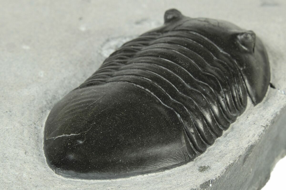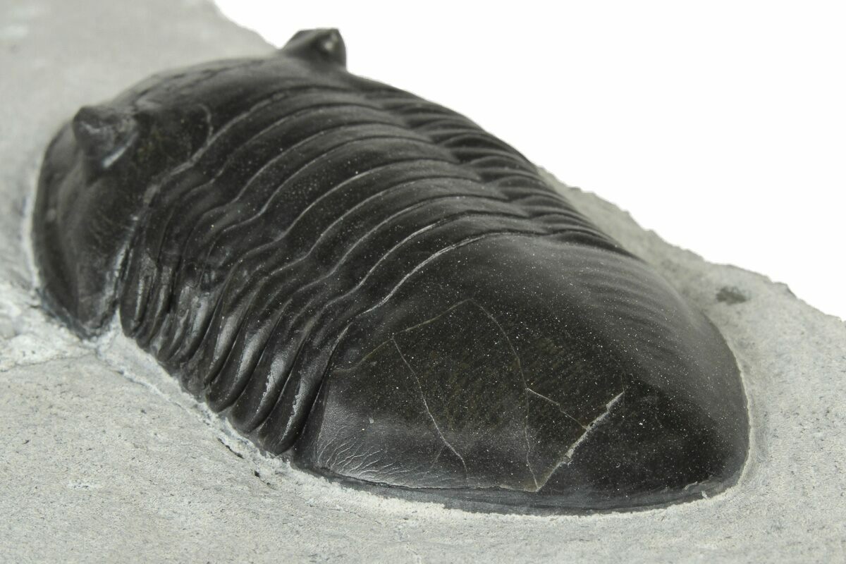 The trilobite is gorgeous with a jet black shell preservation and located near the edge of a piece of limestone. There is some restoration through the middle and left side of the cephalon where the shell fractured during collection and had to be reassembled during preparation.