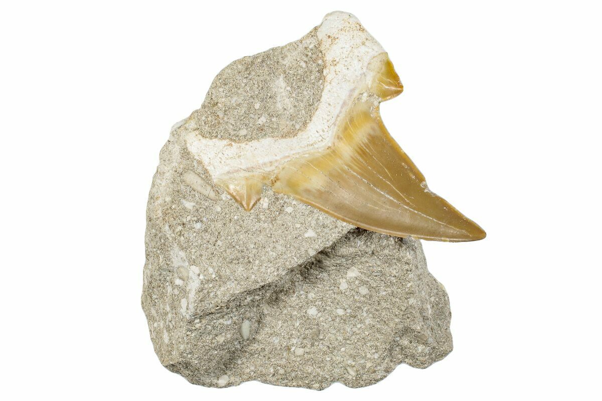 This is a 2.4" fossil tooth of the extinct giant mackerel shark, Otodus obliquus, from the phosphate deposits in the Oulad Abdoun Basin of Morocco. It is Eocene in age, or approximately 54 million years old. The tooth is only partially exposed from the rock in which it was found.