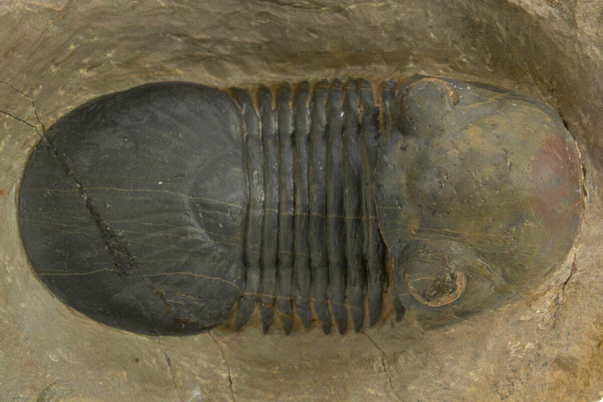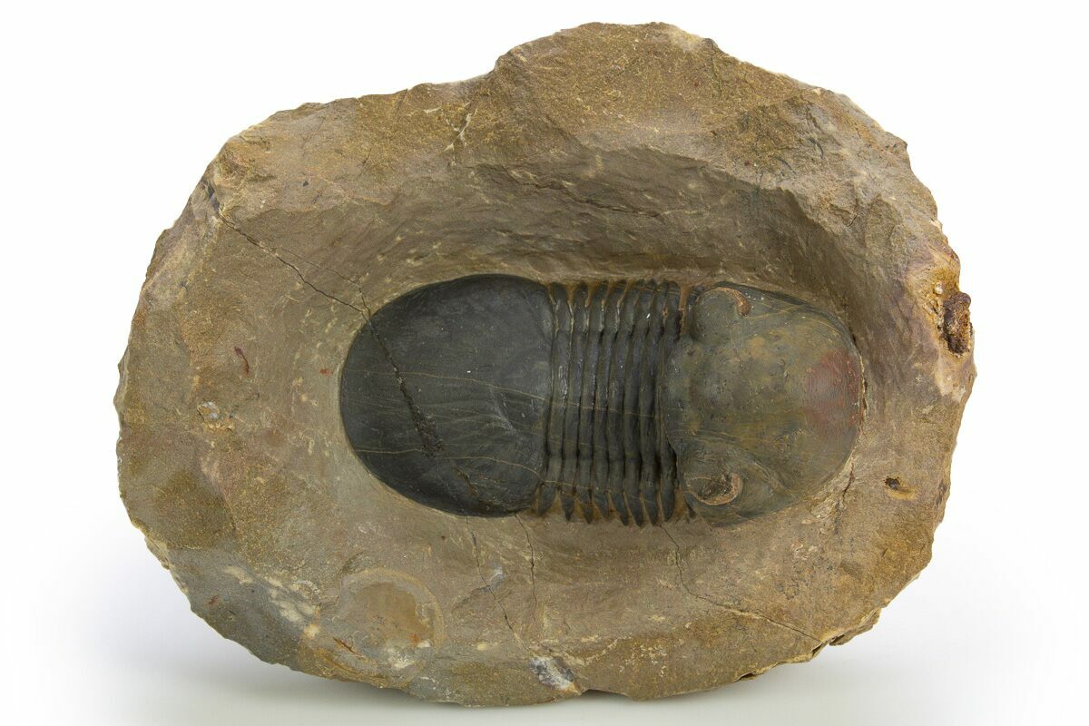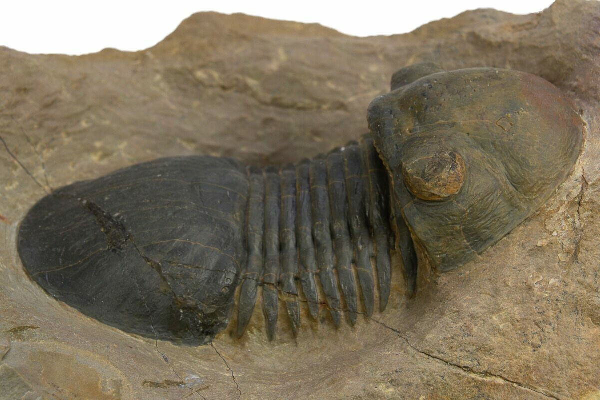 This is a colorful, 2.4" long Paralejurus trilobite quarried at Atchana, Morocco. Under magnification tiny eye facets can be seen in its eyes. It has about 3% shell restoration along repaired cracks.