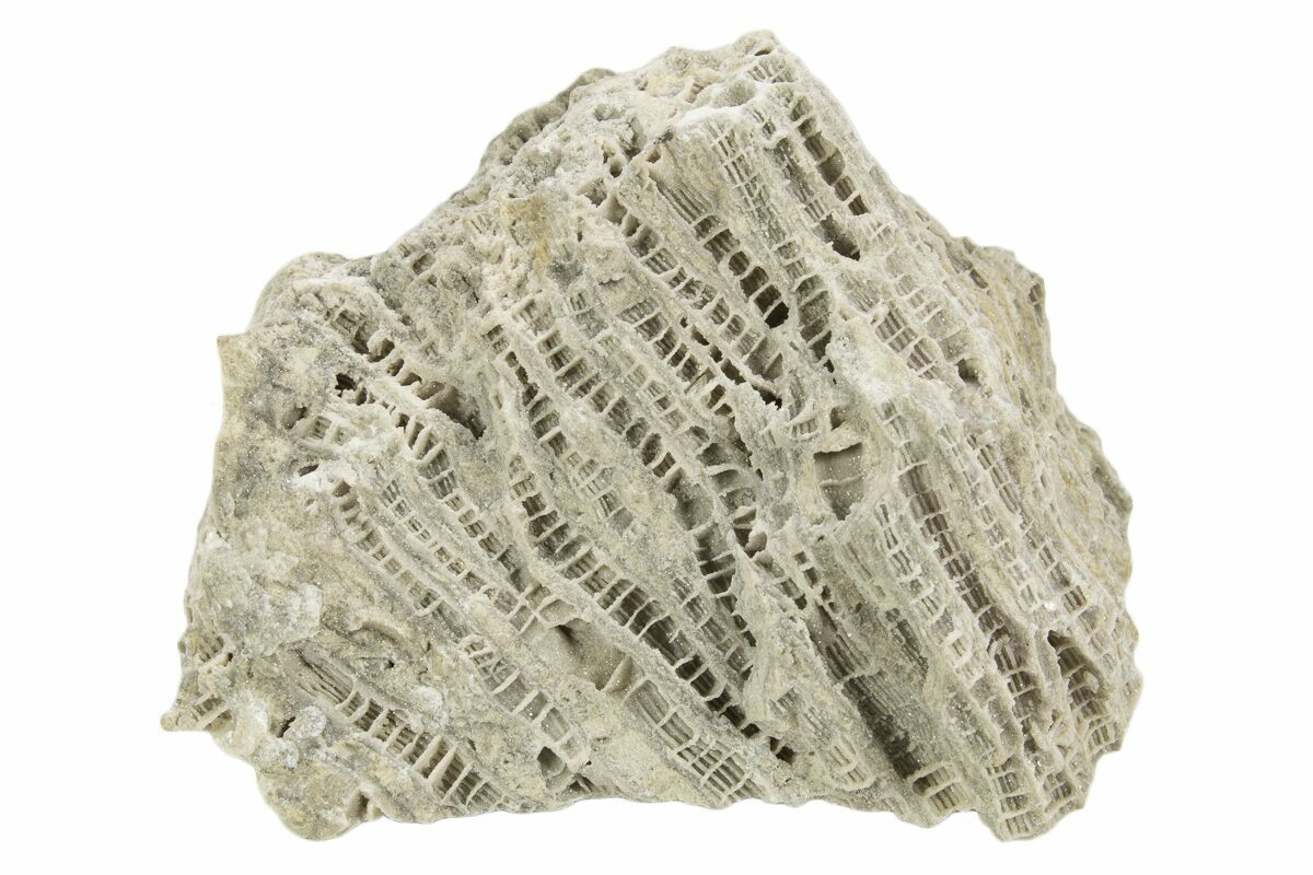This is an interesting 2.4" wide section of dolostone containing fossil rugose coral of the species Fletcheria guelphensis. It has been left in its rough state to reveal the sparkling interior of the coral's "skeleton". The dolostone was collected from a Middle Silurian-aged deposit within the Greenfield Formation in Clay Center, Ohio.