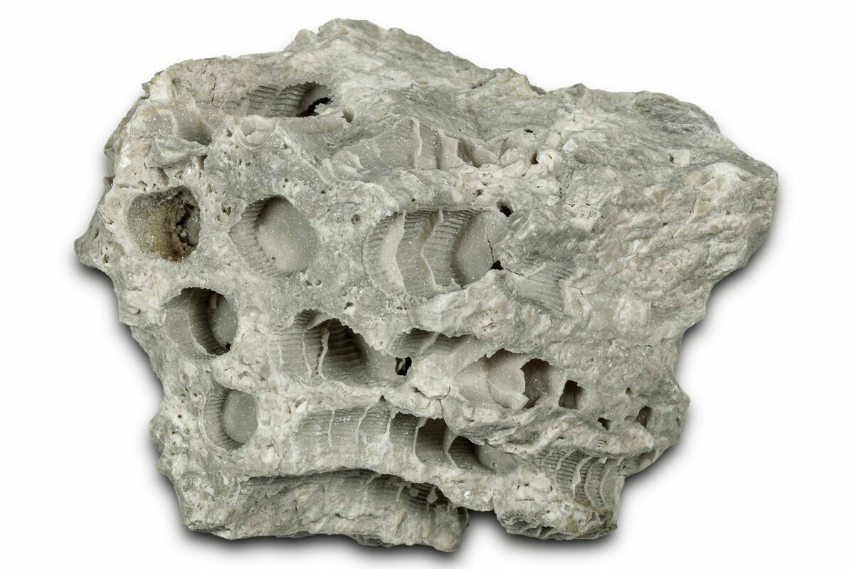 This is an interesting 2.4" wide section of dolostone containing fossil rugose coral of the species Fletcheria guelphensis. It has been left in its rough state to reveal the sparkling interior of the coral's "skeleton". The dolostone was collected from a Middle Silurian-aged deposit within the Greenfield Formation in Clay Center, Ohio.