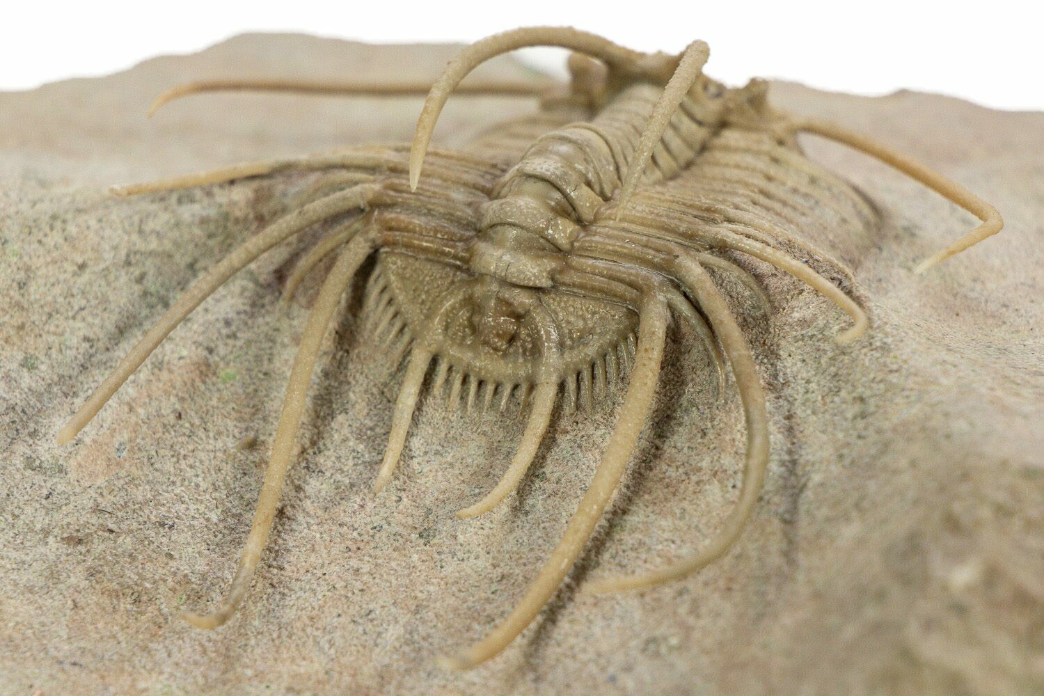 The restoration is very minimal for a trilobite like this. There are a few repaired cracks through a couple of the spines, with one requiring some surface restoration. Overall an exceptional specimen with less than 2% restoration.