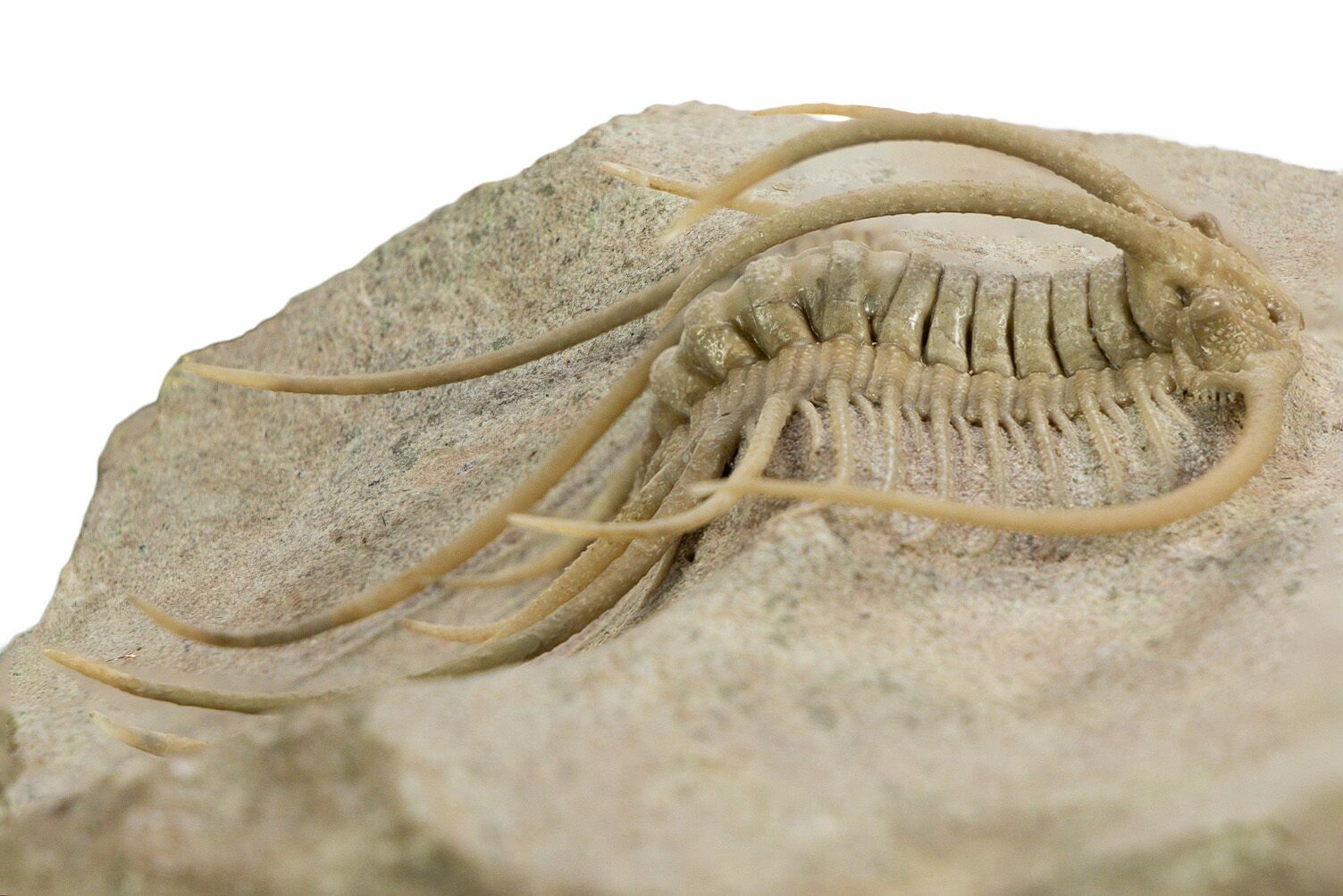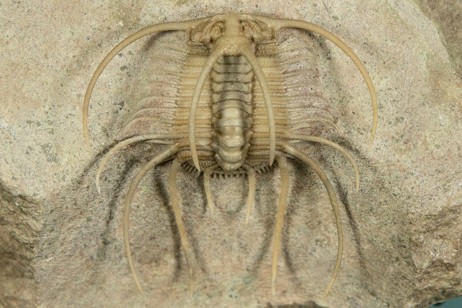 This is an elegant example of a very rare Boedapsis, one of the most spectacular trilobite species in the world. It is a "dream trilobite" from many trilobite and fossil collectors. Not only are they very rare, but they take nearly a month of preparation time (150+ hours) by a master trilobite preparator to complete. It is 2.4" long, laid out prone and has all of its spines, the largest of which are prepped completely free of the surrounding limestone.