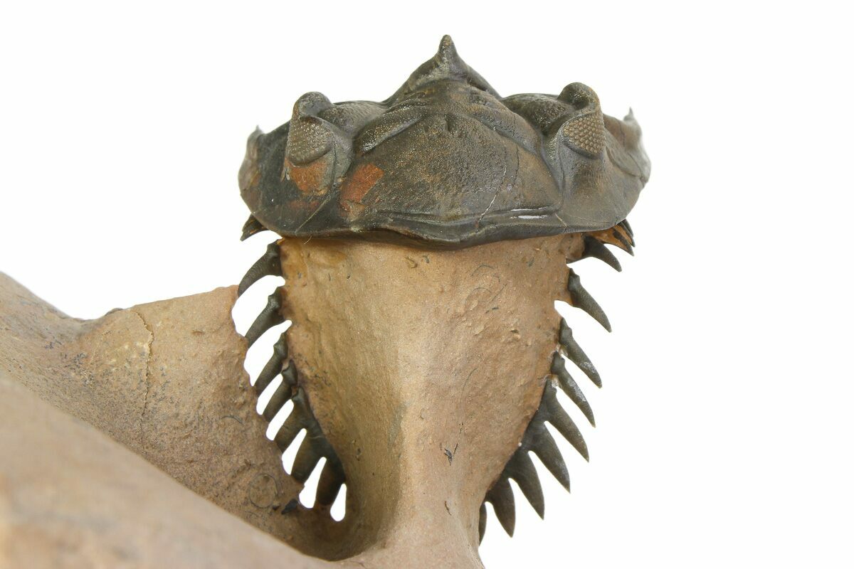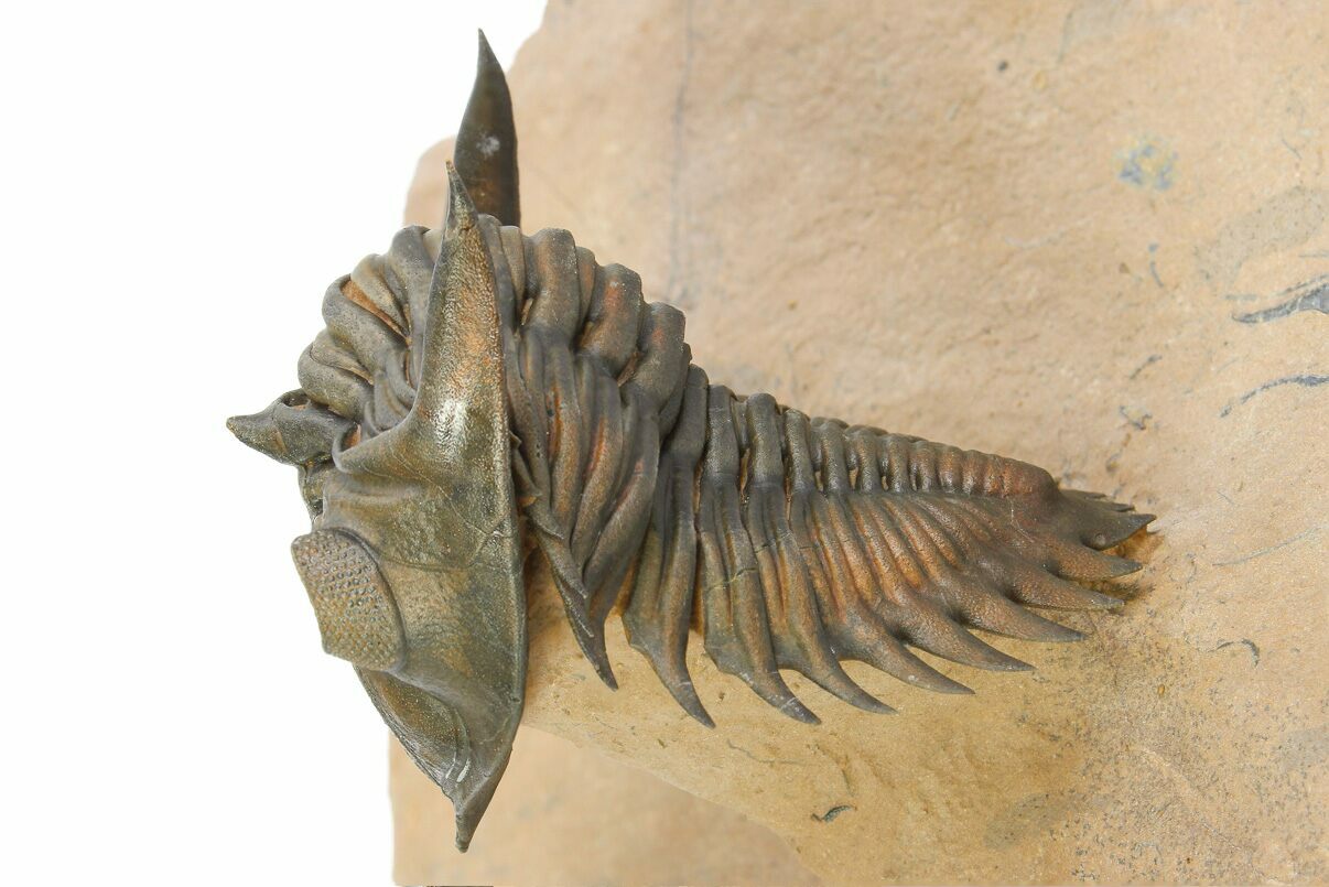 This is a beautiful, 2.4" long specimen of Metacanthina issoumourensis collected near Lghaft, Morocco. It has a beautiful, chocolate brown shell preservation and the preparation is excellent. The rock surrounding the trilobite has been undercut during preparation, bringing it out in high relief. It has about 3-4% shell restoration, all on the right side of its head.