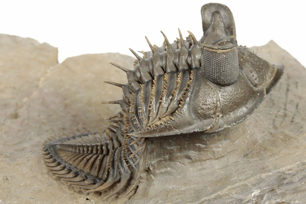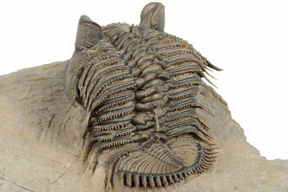 This a 2.4" long (if outstretched), tower-eye, Erbenochile erbeni trilobite from Foum Zguid, Morocco. Excellent preparation with dozens of free-standing spines and clear eye facets. The preparation on this example is exceptional and it has NO RESTORATION.