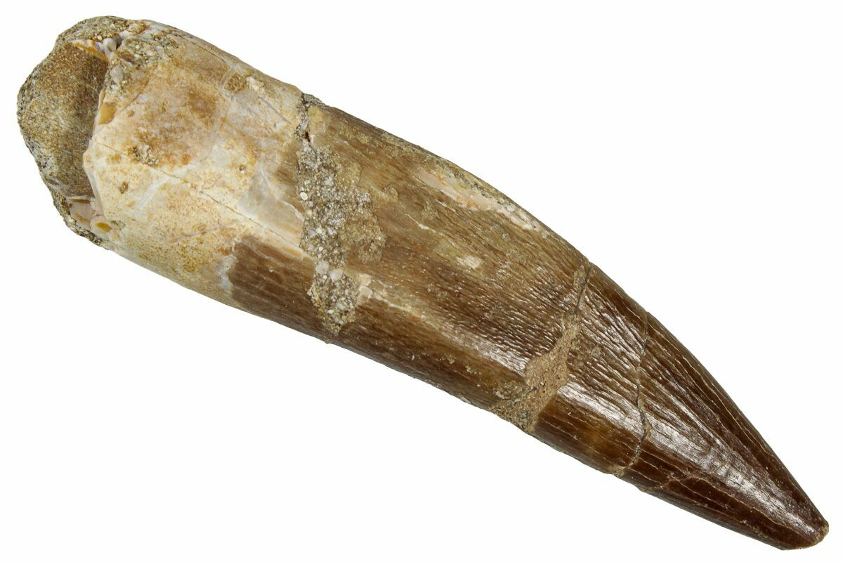 This is a 2.40" tooth from the Cretaceous marine reptile Zarafasaura oceanis, a long-necked plesiosaur known from the phosphate-rich Oulad Abdoun Basin of Morocco. The enamel displays nice preservation and natural coloration.