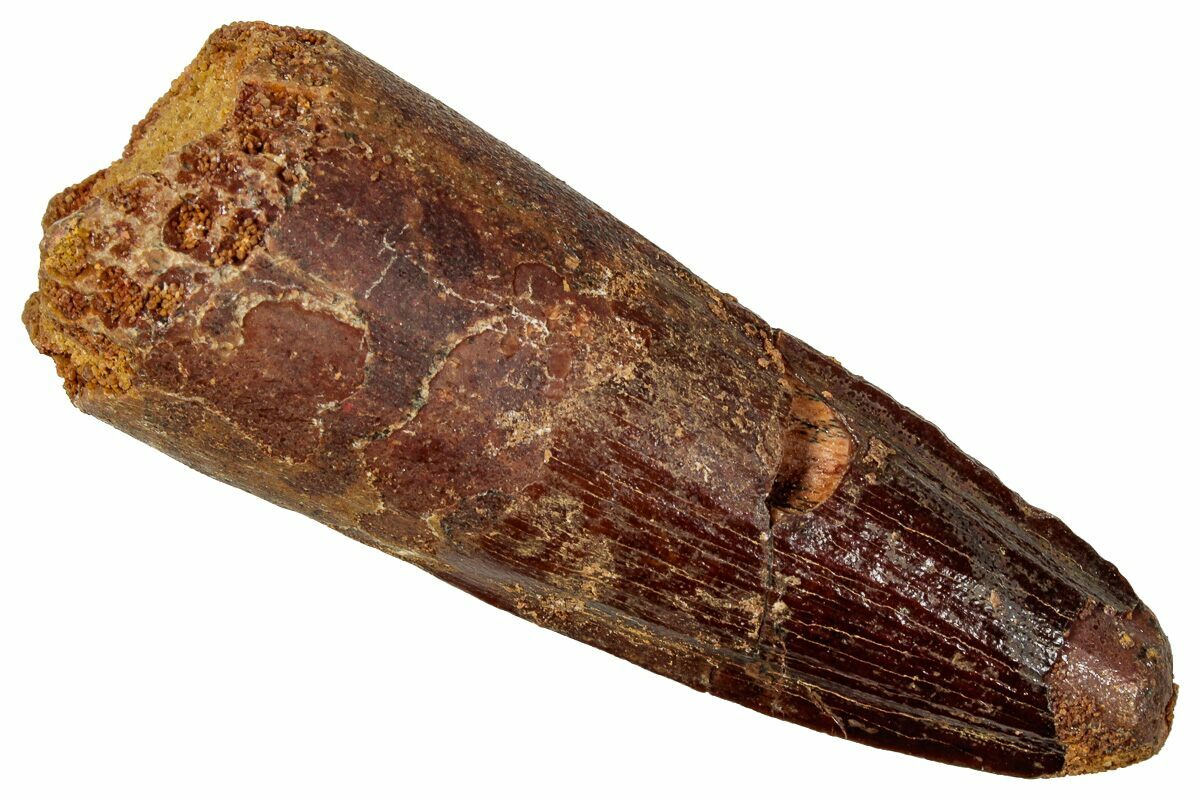 This is a 2.40" long Spinosaurus tooth from the Kem Kem Beds of Morocco. It is Late Cretaceous in age, approximately 95 million years old.