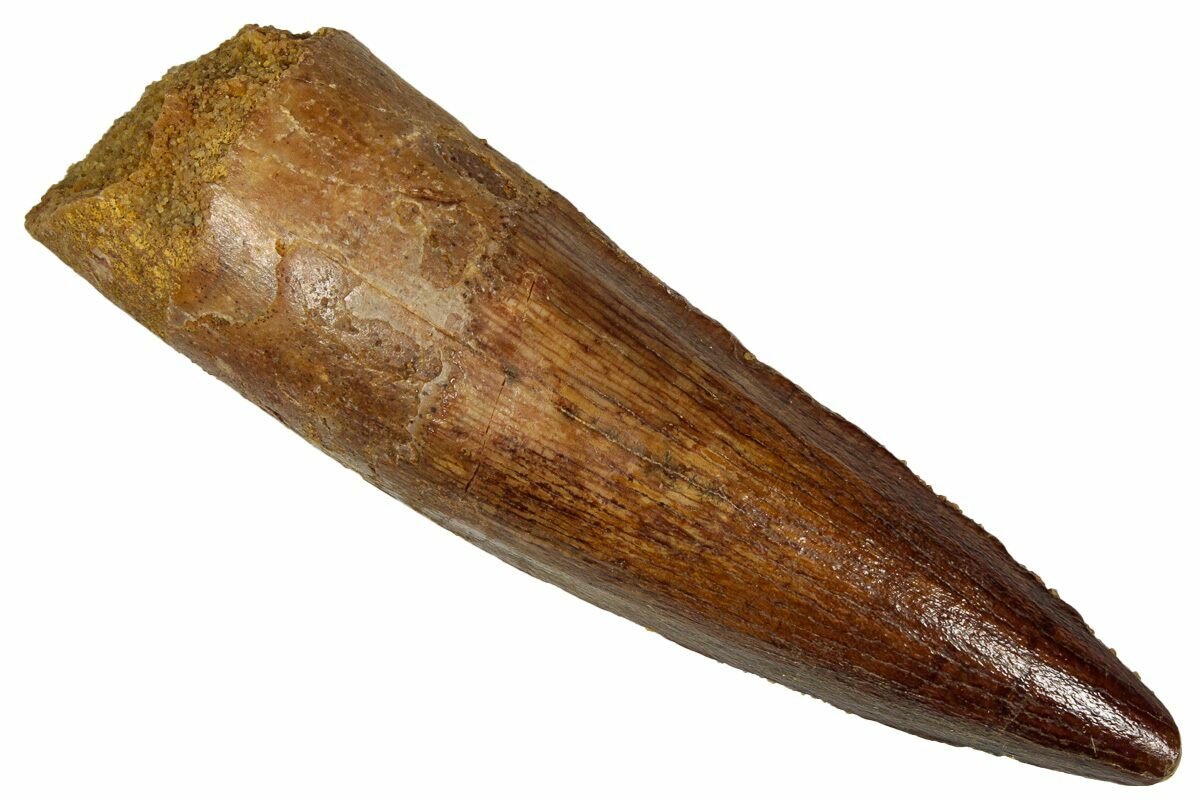 Spinosaurus teeth are relatively common fossils, but large (3+ inches), well-preserved examples are rare. These large Spinosaurus teeth will often be heavily doctored. We’ve seen many examples where multiple partial teeth can been glued to together to create a larger fake tooth, or where enamel has been painted on. One giveaway to look for is a ring of sand around the middle of the tooth, usually glued on to hide a break. Sometimes this is a sign that multiple partial teeth have been composited, but other times it is used to disguise a badly done repair job.