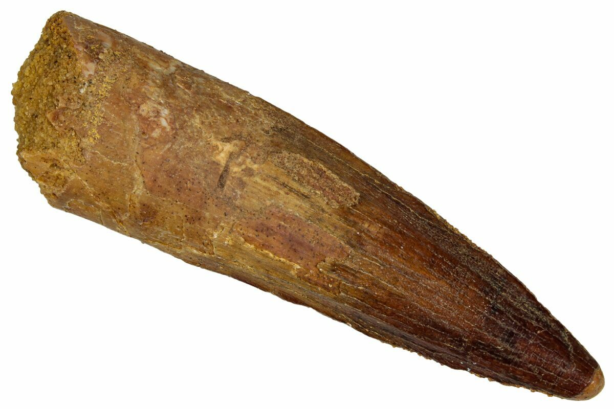 This is a 2.41" long Spinosaurus tooth from the Kem Kem Beds of Morocco. It is Late Cretaceous in age, approximately 95 million years old.