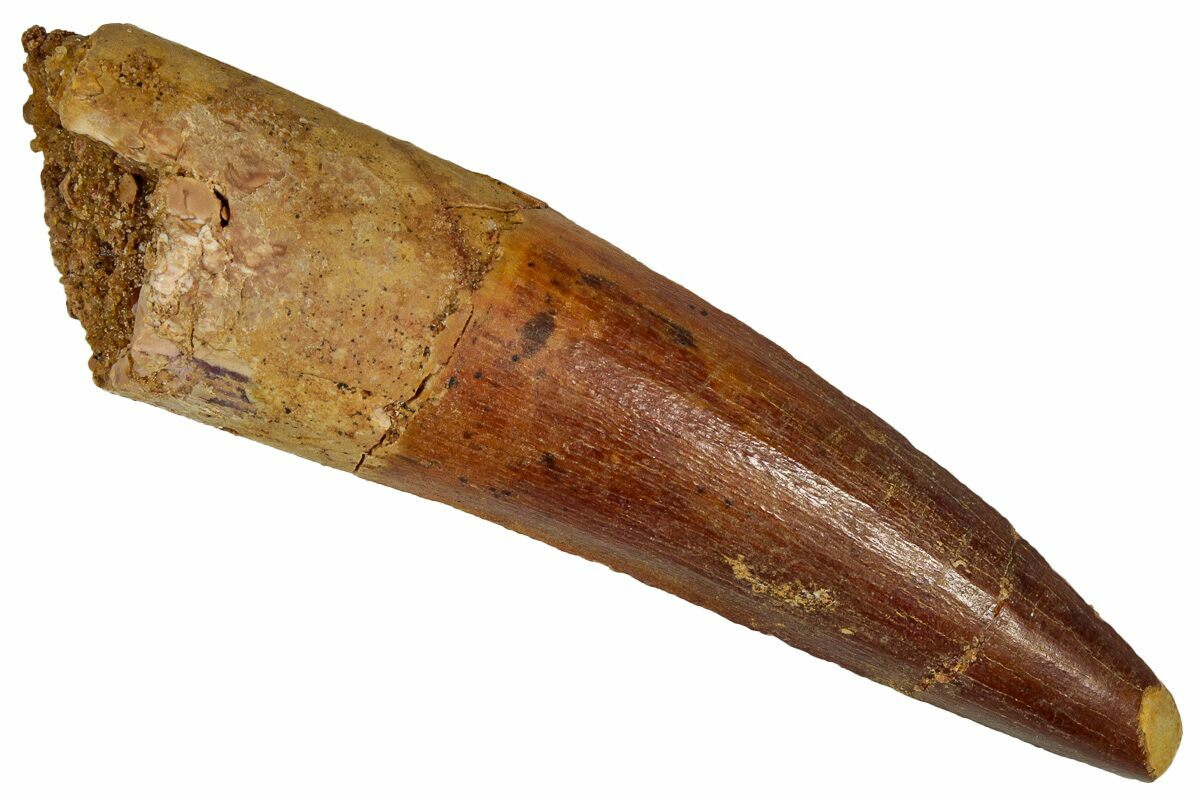 This is a 2.42" long Spinosaurus tooth from the Kem Kem Beds of Morocco. It is Late Cretaceous in age, approximately 95 million years old.