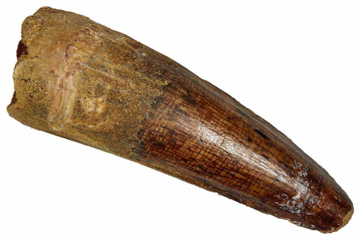 Spinosaurus teeth are relatively common fossils, but large (3+ inches), well-preserved examples are rare. These large Spinosaurus teeth will often be heavily doctored. We’ve seen many examples where multiple partial teeth can been glued to together to create a larger fake tooth, or where enamel has been painted on. One giveaway to look for is a ring of sand around the middle of the tooth, usually glued on to hide a break. Sometimes this is a sign that multiple partial teeth have been composited, but other times it is used to disguise a badly done repair job.