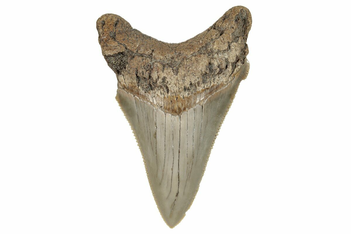 This is a beautiful, serrated, 2.42" long fossil Otodus angustidens shark tooth. Angustidens is believed to be an ancestor of the fearsome Megalodon shark, though it did not grow nearly as large.