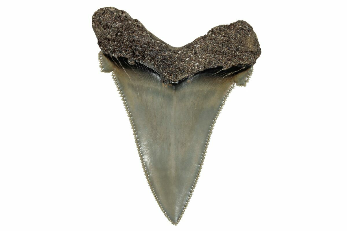 This is a gorgeous, serrated, 2.44" long fossil Otodus angustidens shark tooth. Angustidens is believed to be an ancestor of the fearsome Megalodon shark, though it did not grow nearly as large.