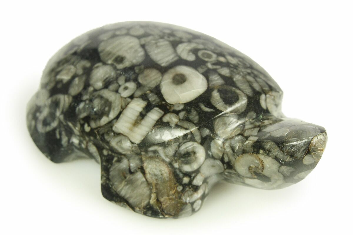 This is a beautiful polished turtle sculpture carved from a block of marble that's packed with crinoid stem fossils. This little guy measures 2.45 inches long and is polished to a glossy finish.