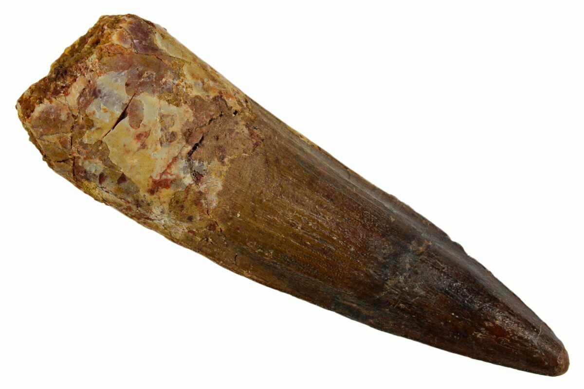 This is a 2.45" long Spinosaurus tooth from the Kem Kem Beds of Morocco. It is Late Cretaceous in age, approximately 95 million years old.
