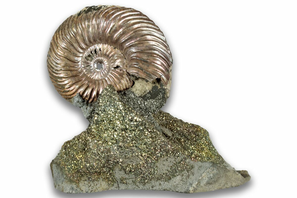 This is an interesting and colorful pyritized ammonite (Quenstedticeras sp.) display. The ammonite was collected from the Middle Jurassic age deposits along the banks of the Volga River near Saratov, Russia. It has been mounted to this section of iridescent pyrite ("rainbow pyrite") encrusted rock to create this alluring display.