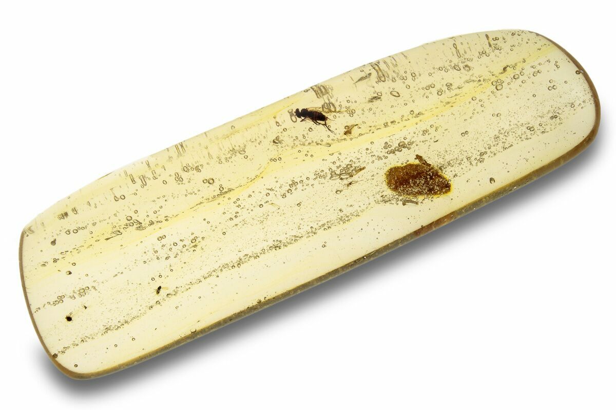 This is a polished piece of copal from Colombia. It contains a tiny beetle (order Coleoptera) and multiple fly (order Diptera) fossils. The copal bears gorgeous golden honey coloration, measures 2.45" wide, and weighs 7.9 grams. The entire specimen has been polished to a glossy-finish.