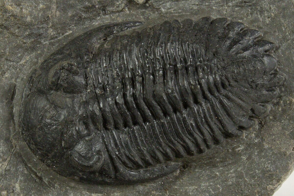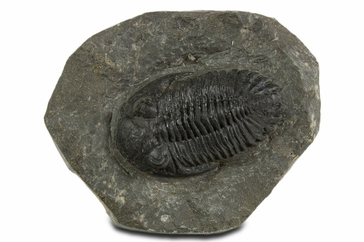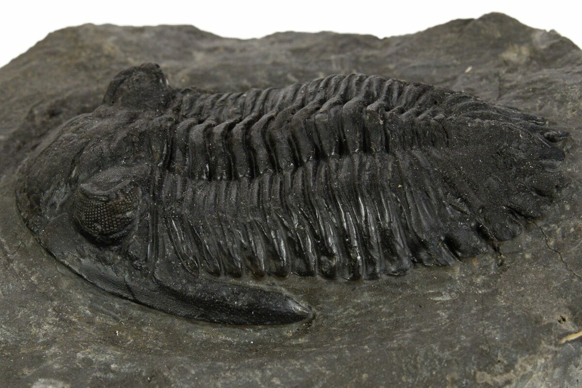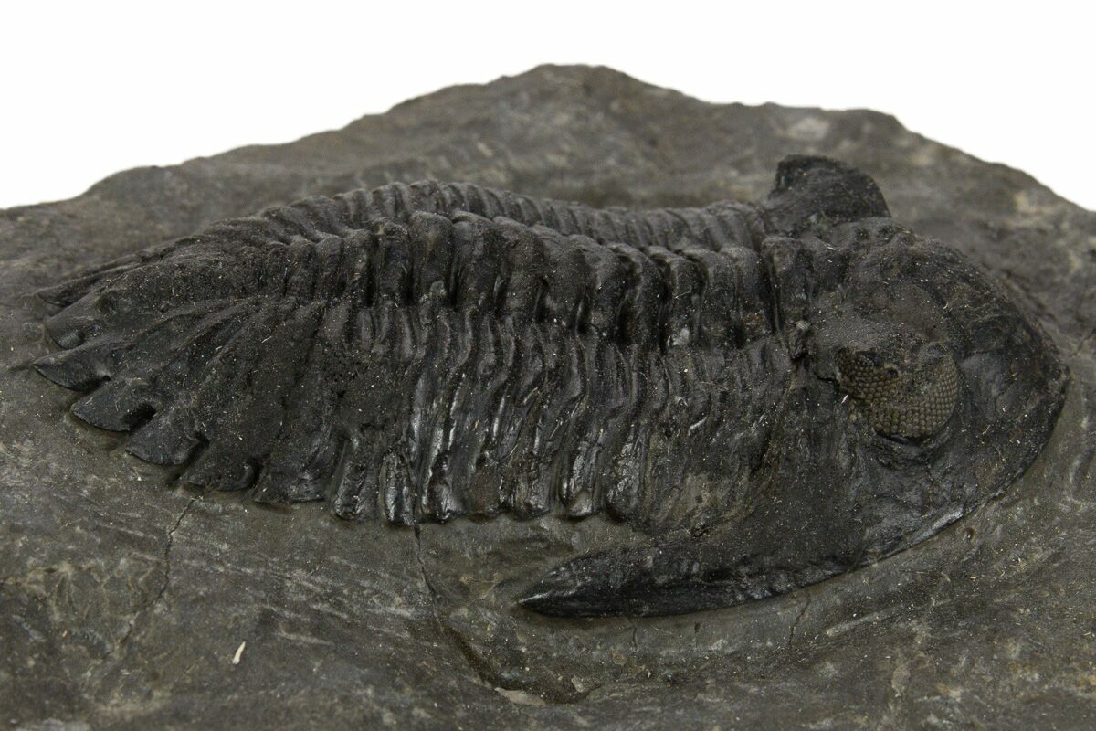 This is a detailed, 2.45" long Hollardops trilobite fossil quarried near Ofaten, Morocco. It has visible eye facet preservation in both eyes. This specimen has less than 1% shell restoration..