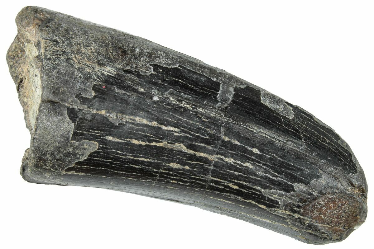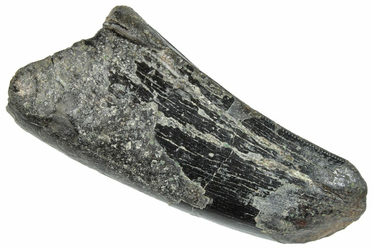 This is a beastly, 2.45" long tyrannosaur tooth collected last summer from the Two Medicine Formation of Pondera County, Montana. The serrations are fairly worn but can be found along the distal edge. There are two repaired cracks through the tooth, with some very minor gap fill restoration within one of the cracks.