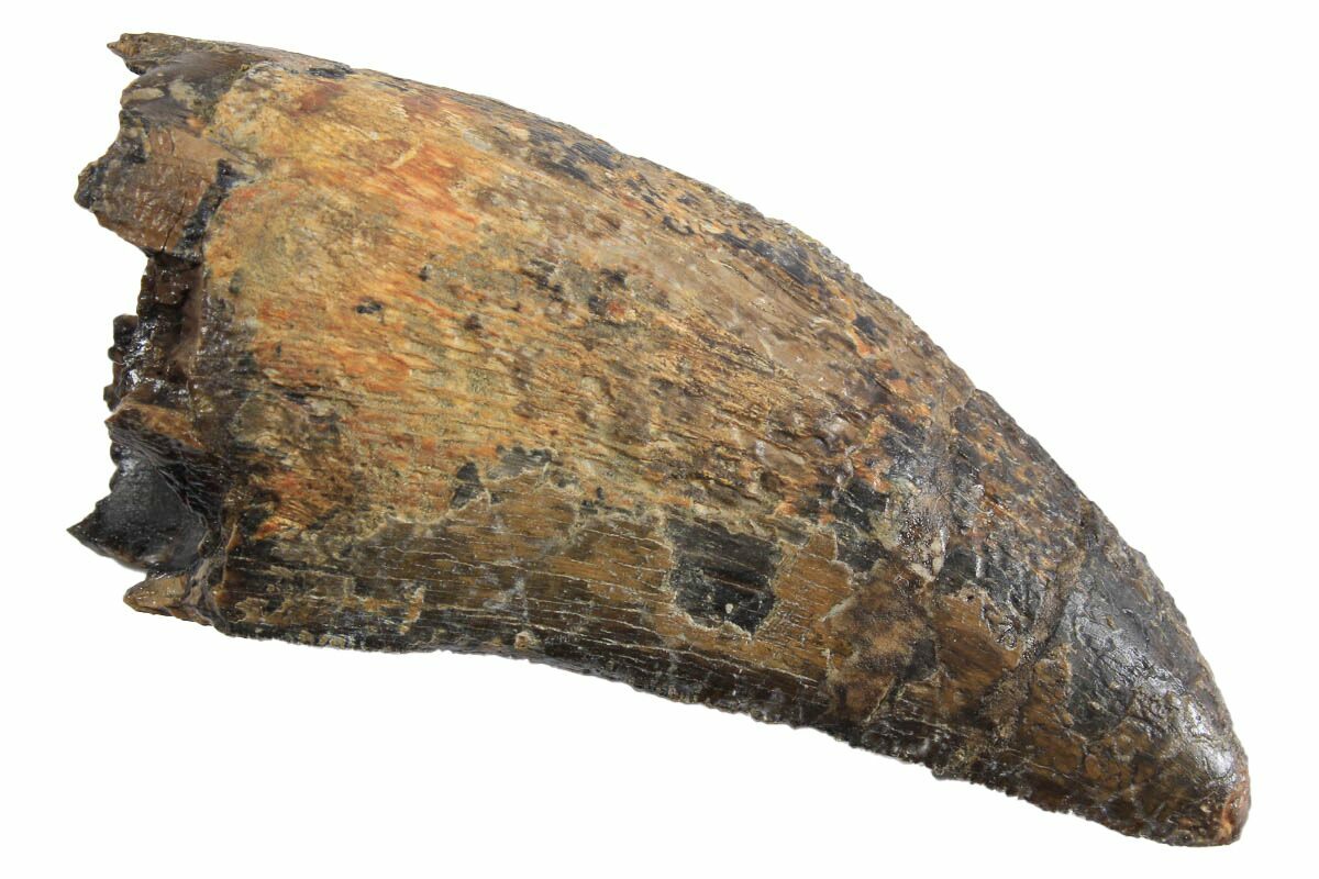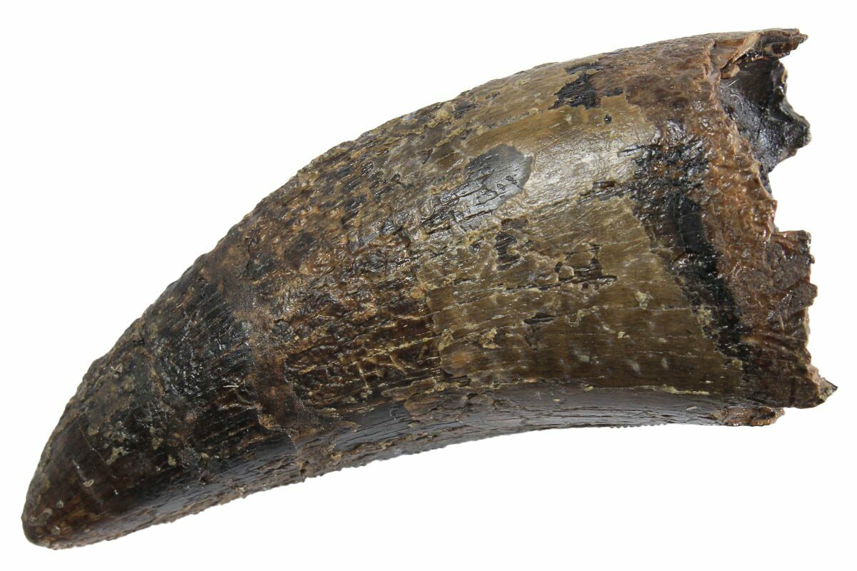 This is a 2.47" long tooth from Tyrannosaurus rex, collected from the Lance (Creek) Formation of Wyoming. It's fairly robust and small spots of serration preservation can be found along the distal edge. True T. rex teeth are some of the most sought-after and collectible fossils out there.