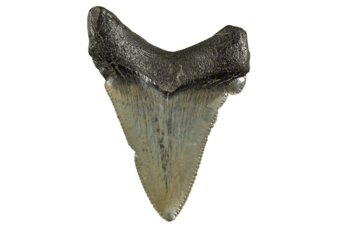 This is a serrated, 2.480" long fossil Otodus angustidens shark tooth. Angustidens is believed to be an ancestor of the fearsome megalodon shark, though it did not grow nearly as large.