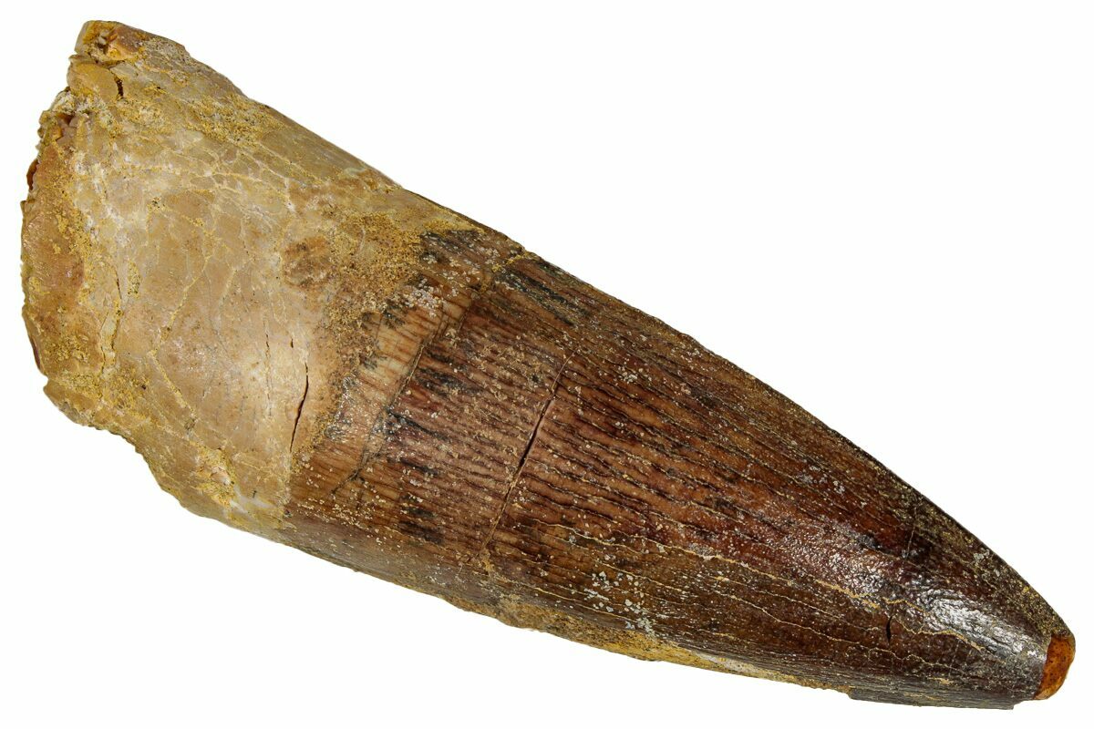 This is a 2.49" long Spinosaurus tooth from the Kem Kem Beds of Morocco. It is Late Cretaceous in age, approximately 95 million years old.