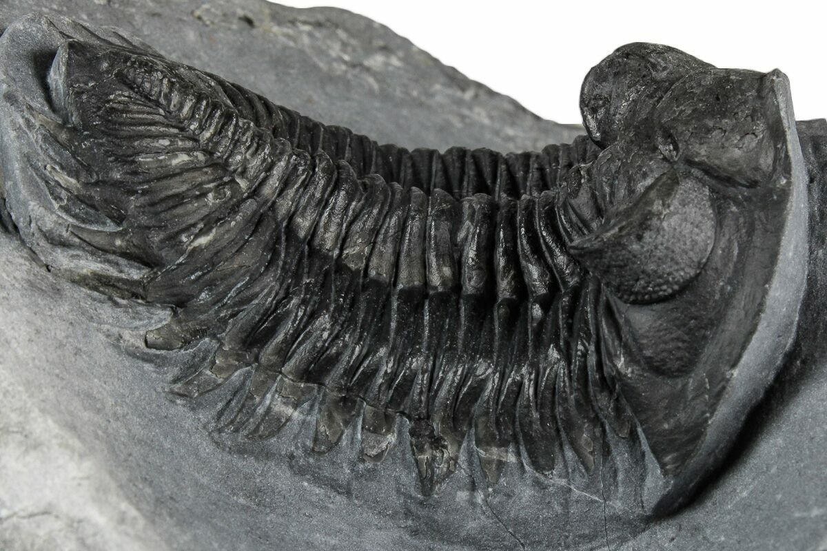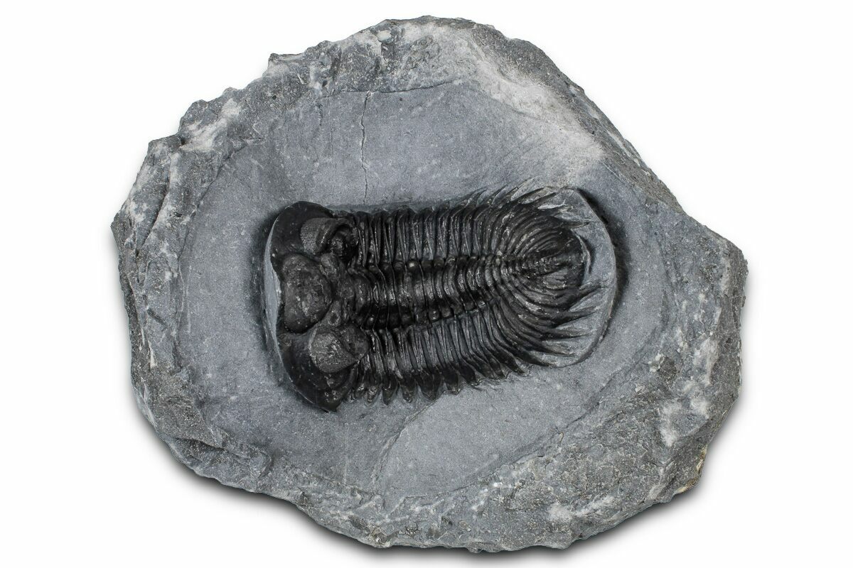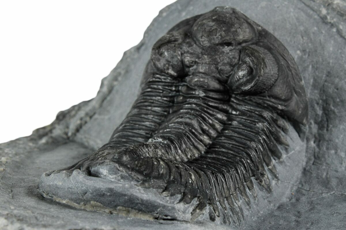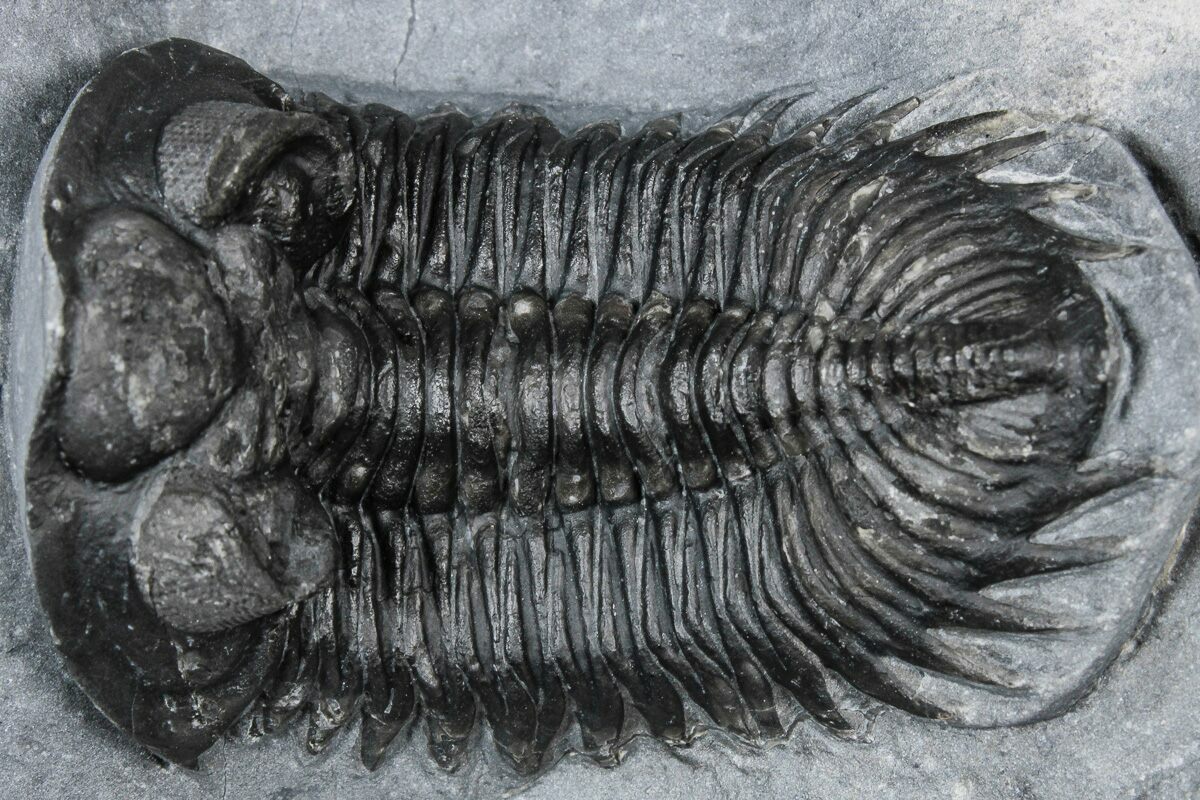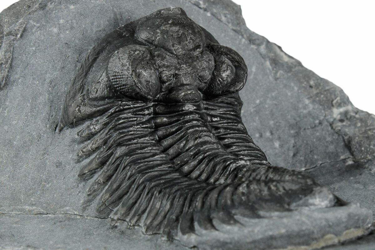 This is a 2.5" long, Coltraneia trilobite with amazing "tower eyes" full of hundreds of eye facets. The genus has often been referred to as Treveropyge in the past. It was quarried at Ofaten Mountain, Morocco.