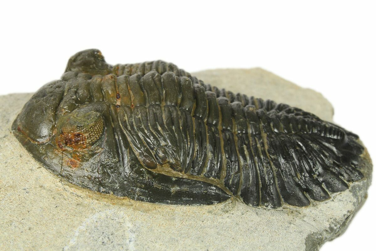This is a detailed, 2.5" long Hollardops trilobite fossil quarried near Ofaten, Morocco. It has orange eye facet preservation in both eyes. Total shell restoration is 3-4%.