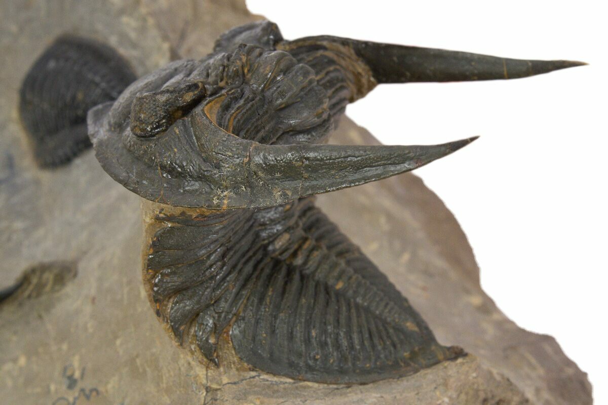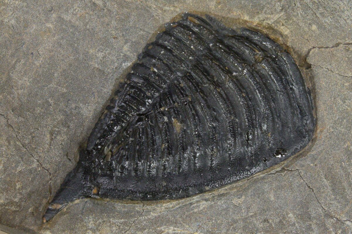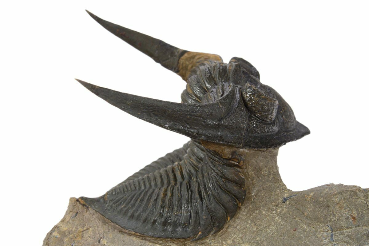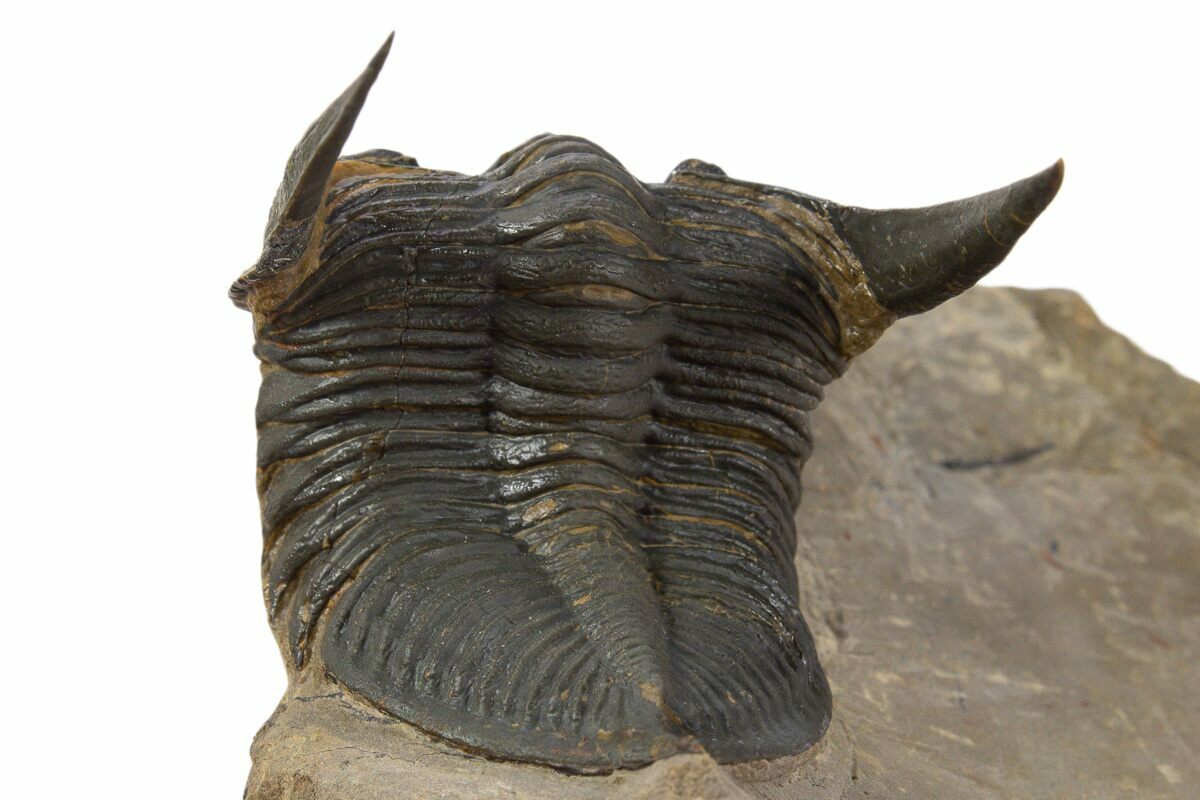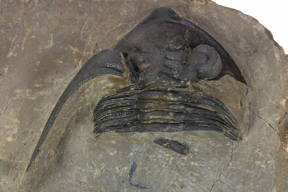 This is a stunning, 2.5" long Zlichovaspis trilobite fossil from collected near Atchana, Morocco. It is fantastically prepared and there is another disarticulated Zlichovaspis and head of a Reedops present on the limestone. Total restoration is less than 1% along repaired cracks.