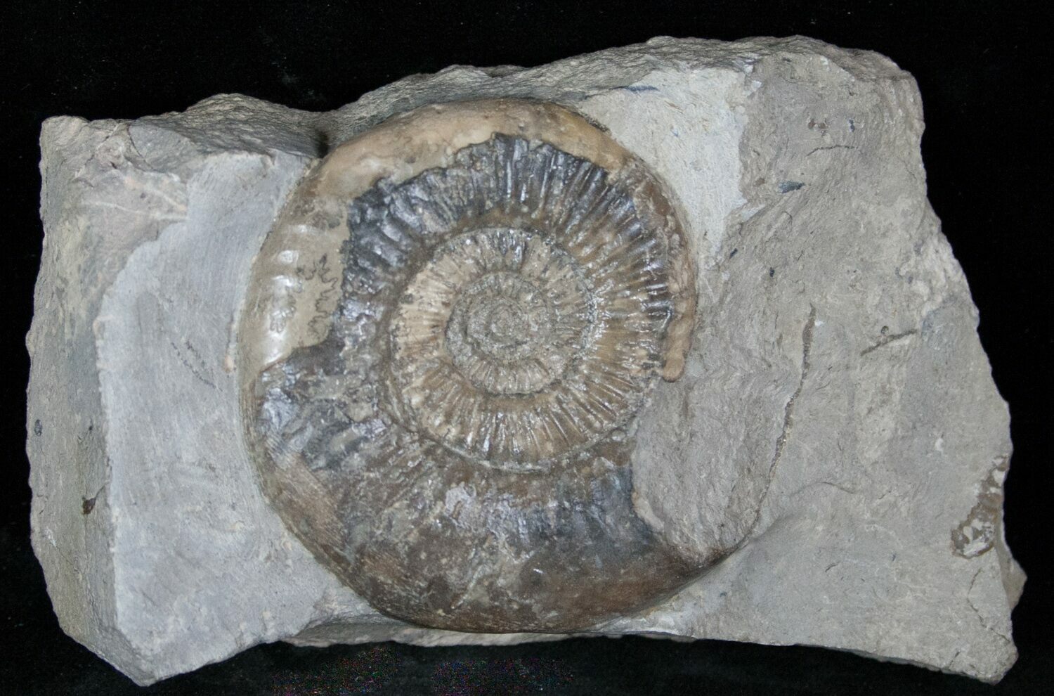 This is a Lower Jurassic ammonite of the species Dumortiera collected near Aalen, Germany. The specimen is 2.5" wide and has been nicely prepared so that it displays very aesthetically on a block of limestone.