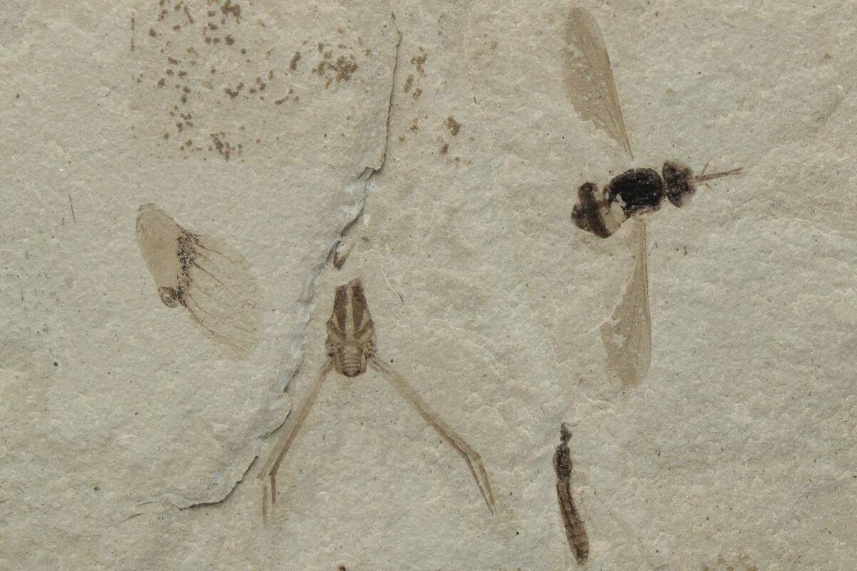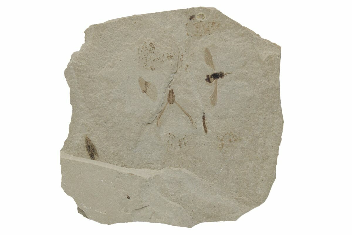 This 2.5" wide piece of shale contains a detailed fly fossil with preserved proboscis (order Diptera), what appears to be a partial water strider (family Gerridae), and a partial unidentified leaf, collected from the Green River Formation of Uintah County, Utah. While this formation is best known for well preserved fossil fish found in Wyoming, other sections of the formation contain a very diverse insect fauna.
